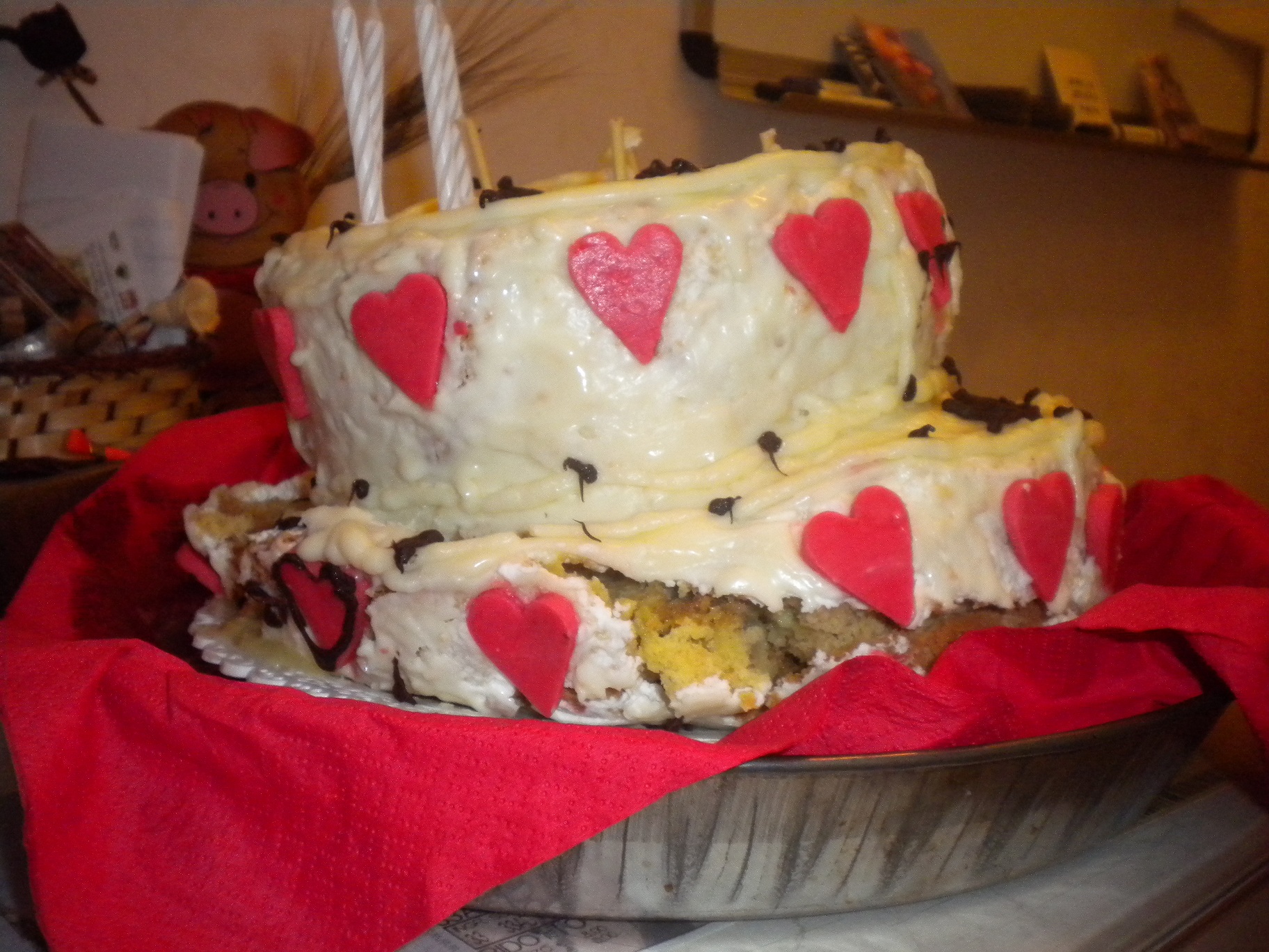 In effetti era la mia prima torta a due piani, e s’è visto!!! Ci sono rimasta malissimo quando mi si è spatasciata la ciotola di sopra su quella di sotto (ho messo solo degli stecchini lunghi che passavano dal piano di sotto a quello di sopra, ho appoggiato la torta di sopra senza mettere un altro vassoio), e vedrete anche la fase del crollo, oltre che quello che ne è rimasto, però a parte questo…ammazza se era buona