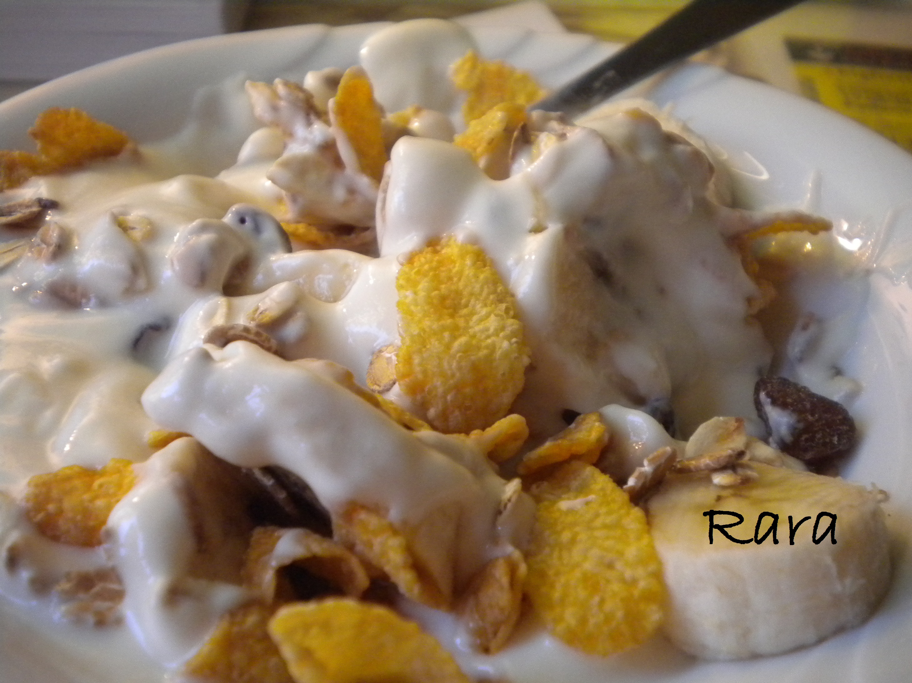 …davvero buonissima!!! Il tutto è nato dall’avere dei musli regalatomi da mangiare, ma così a secco per me non sono proprio il massimo e così, con una parte ho prepaarto dei biscottini che poi posterò, e con altri ho iniziato ad unirli ad un frutto, yogurt e cornflakes 😛