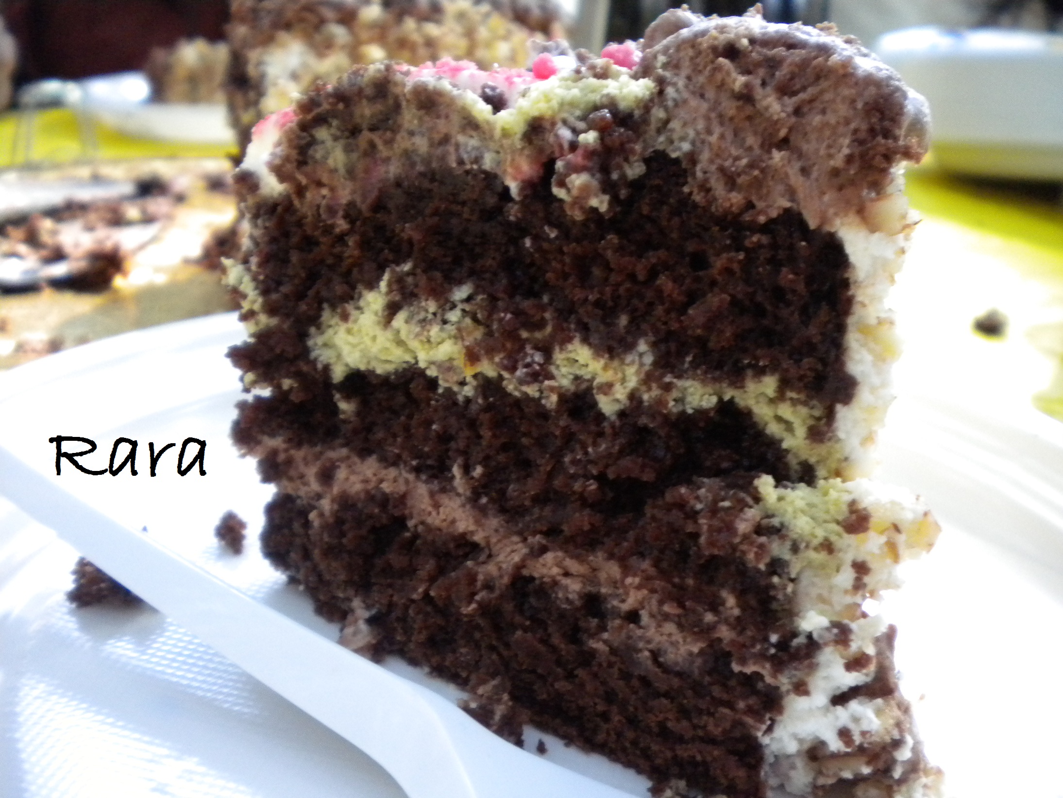 cmq secondo me la farcitura di crema al pistacchio con un impasto base al cioccolato ci sta benissimo!!!e due strati puoi farli perfettaemnte! per quante persone sarà la torta?