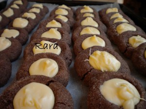 Frollini: metà bianchi metà al cioccolato, a forma di krumiri, a fiorellino con marmellata di fragole (mia), crema al ciocco (di raff vedi sopra), mandorle, nocciole, cornflakes, con codette colorate)