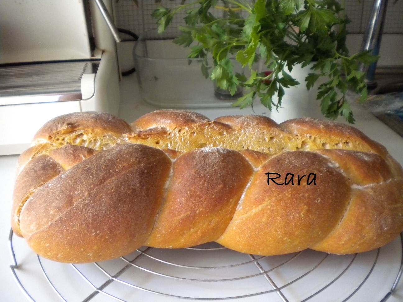 Arrotolare ora in un unico lungo rotolo (verrà con diametro circa 3-4 cm) tutta la pasta, tagliarne 1/3 e posizionarlo alla metà del torolo lungo facendolo accavallare x tenerlo fermo e formare così una treccia che si lascerà riposare e lievtare fino al raddoppi odel suo volume (a me 4h)
