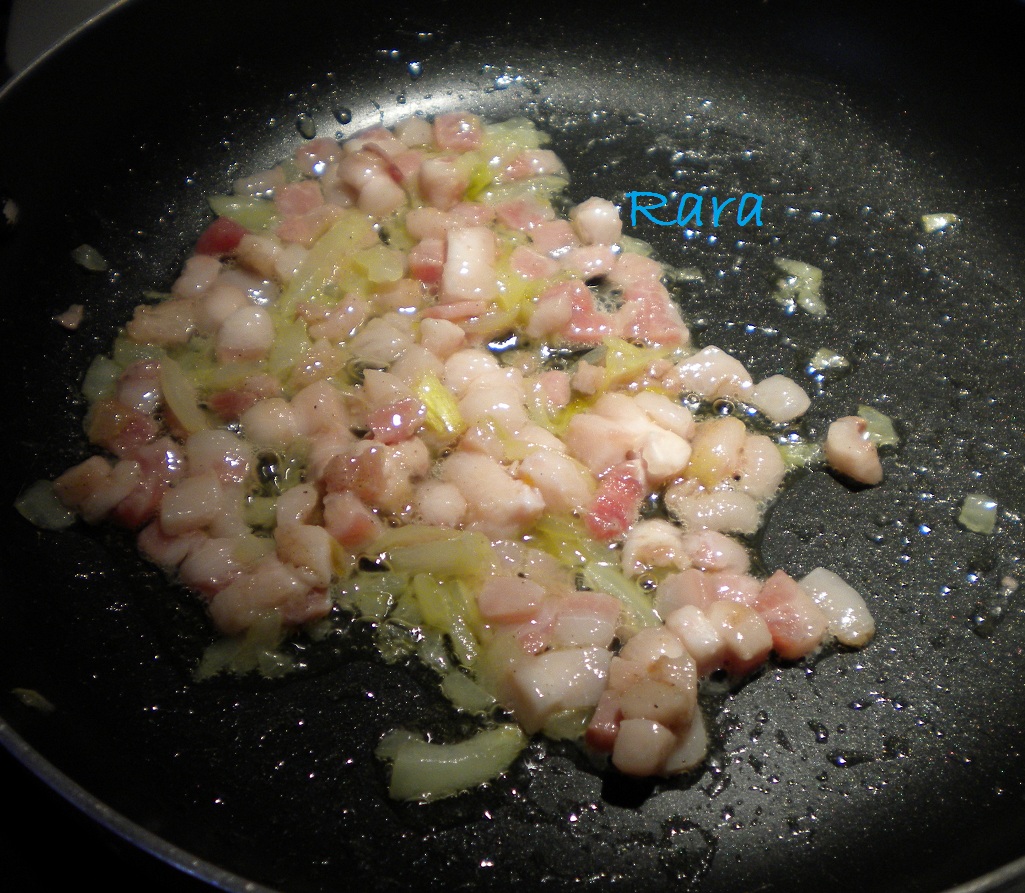 in una padella con un po’ d’olio far soffriggere la cipolla a fuoco bassissimo, fino a schiarirsi, precedentemente tagliata a julienne; aggiungere poi il guanciale a dadini e già un po’ di pepe.