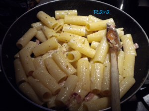 Nel frattempo cuocere i rigatoni in acqua salata e prendere un po’ dell’acqua per mescolarla al pecorino grattugiato e il pepe e sbattere con una forchetta, fino ad ottenere una cremina abbastanza densa che allungherete ancora se necessario.
