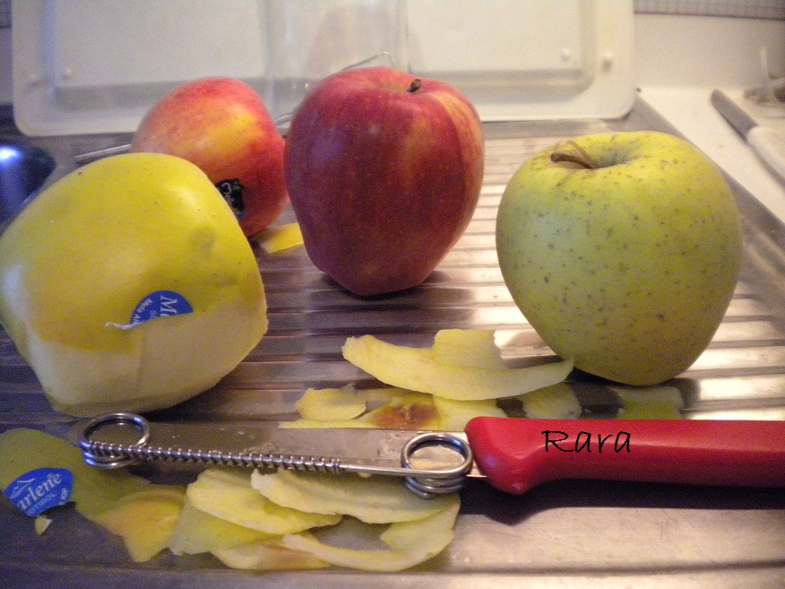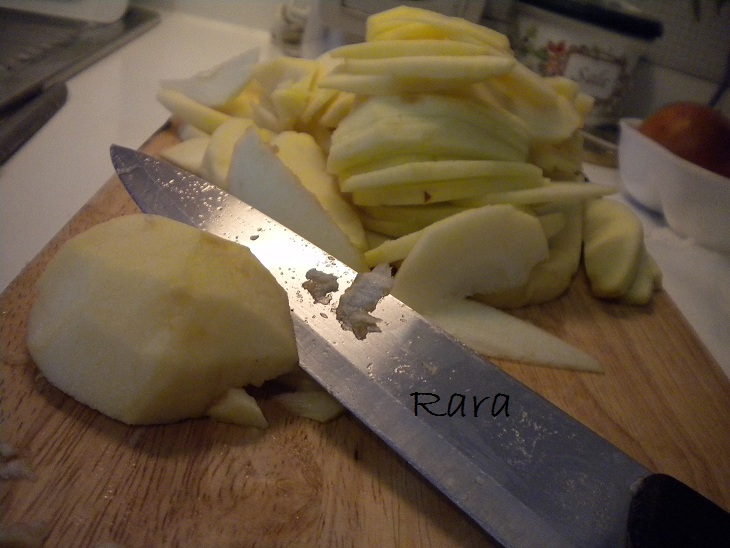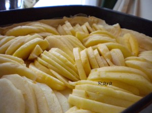 Semplicissimo il procedimento: foderare una teglia 24-26cm di diametro oppure come me una teglia quadrata, cona la carta forno e la sfoglia bucherellata sul fondo. Tagliare le mele a fettine sottili.