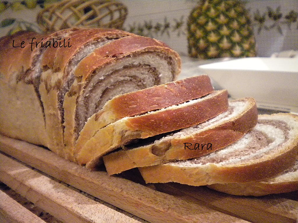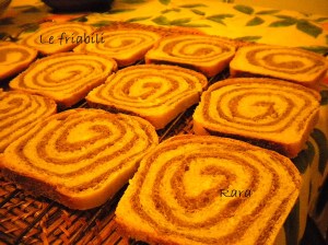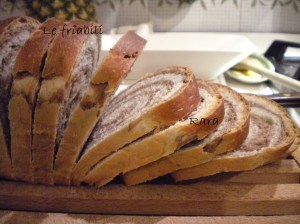 dalle 9 alle 14.30 fuori frigo a lievitare ancora, quando ho formato il rotolo dai due impasti stesi separatamente alla stessa larghezza dello stampo e poi sovrapposti usando un po’ di latte come collante