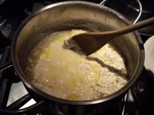 togliere dal fuoco e aggiungere tutta la farina iniziando a mescolare con un cucchiaio di legno,