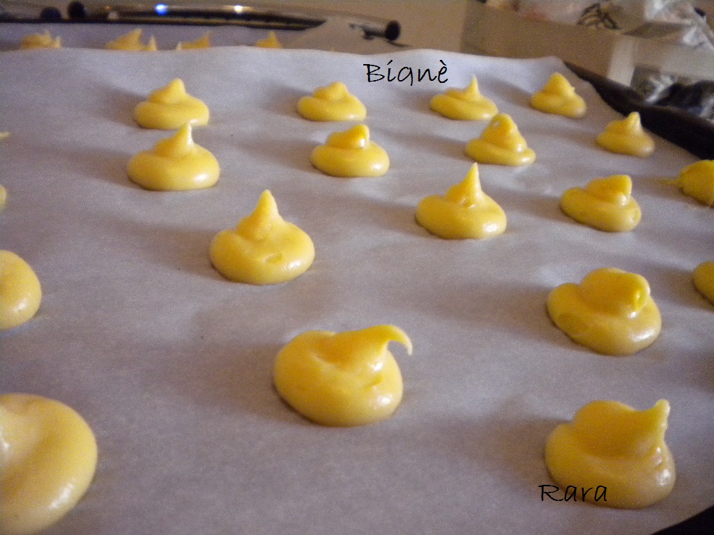 Riempire un sac à poche con beccuccio grande e liscio e formare dei ciuffetti di circa 3 cm ben distanziati fra loro xk gonfiano molto in cottura.