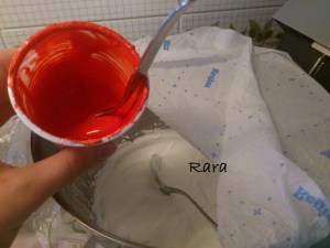 Dopo aver montato la glassa quindi, l’ho distribuita in bicchieri e ho aggiunto il colorante in polvere rosso per  la parte pennuta, in gel giallo per il becco e una punta di nero per la pancia, in gel verde per il pratoe liquido blu per la scritta, realizzata allo stesso modo del disegno, usando il font del gioco!