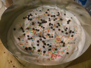 l’ho farcita, aggiungendo anche codette nella crema e sopra sperando che con il taglio della fetta si vedano i colori 🙂