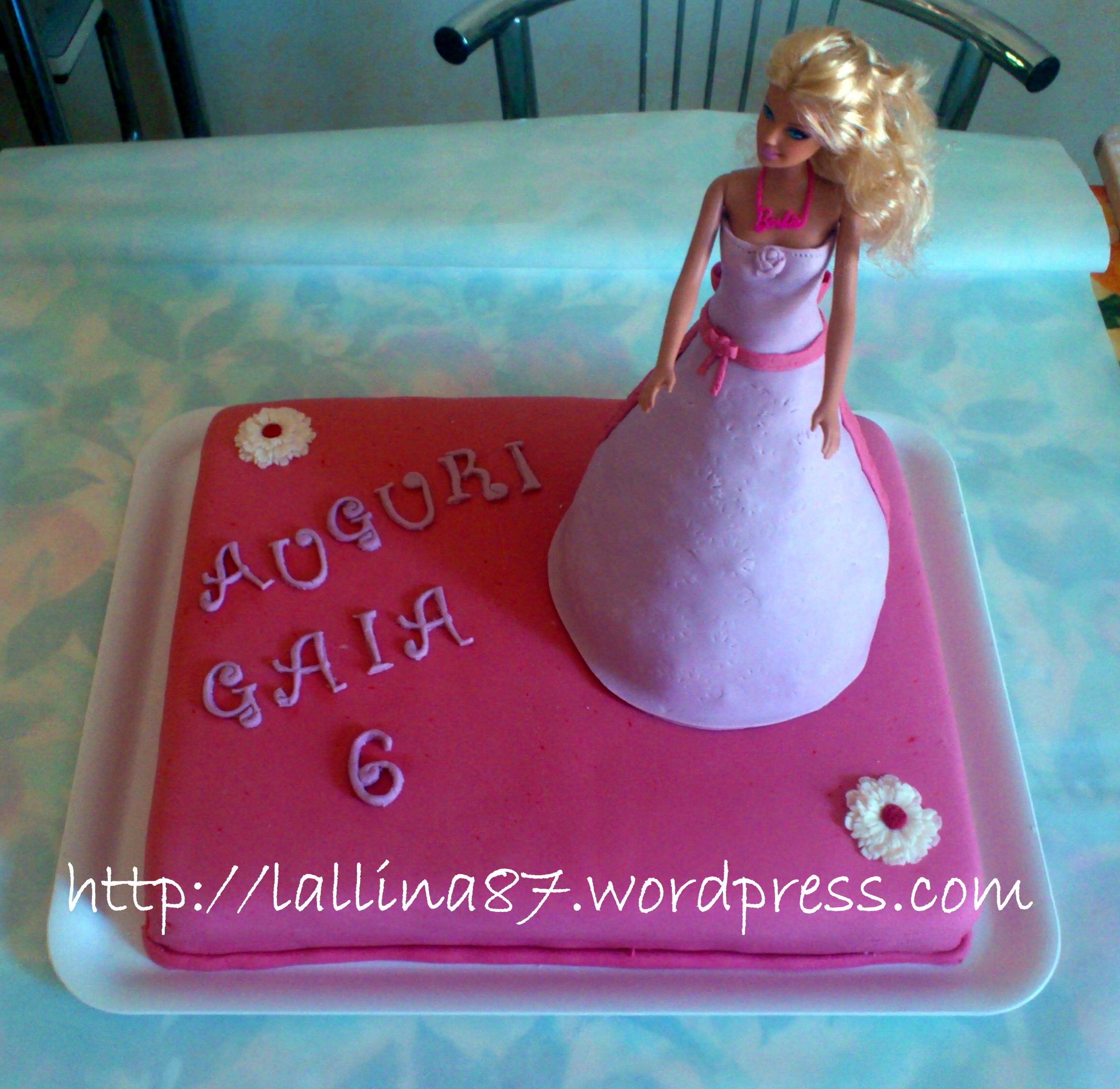 Ecco l’ultima grande fatica, beh sì per via del caldo e della stanchezza che porta con sè ci ho messo parecchio a fare questa torta e in più è stata una grande prova per me, non avendo mai fatto una “Barbie Cake”. In realtà rispetto alle tante che si vedono in giro risulta molto più semplice, meno principesca o meglio, pomposa! Questa è una Barbie di classe mica no! Fiocco e dettagli del colore della collana, che riprendono la base della torta, il pavimento direi; corpetto con rosellina al petto e ricami di rosa per tutto il vestito 😀