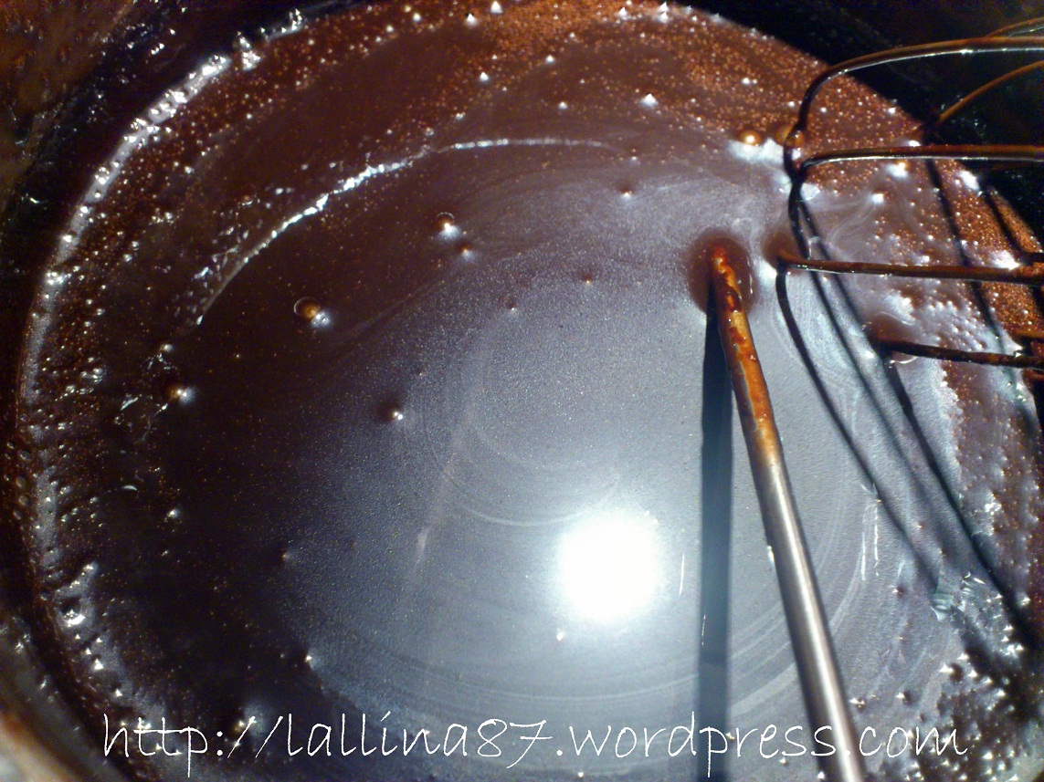 Il bello di questa glassa è che rimane lucida anche dopo il passaggio in frigo, non si opacizza, non si ricristallizza lo zucchero e il cacao non riforma la patina, vedete il riflesso del quadro appeso in cucina? 😉