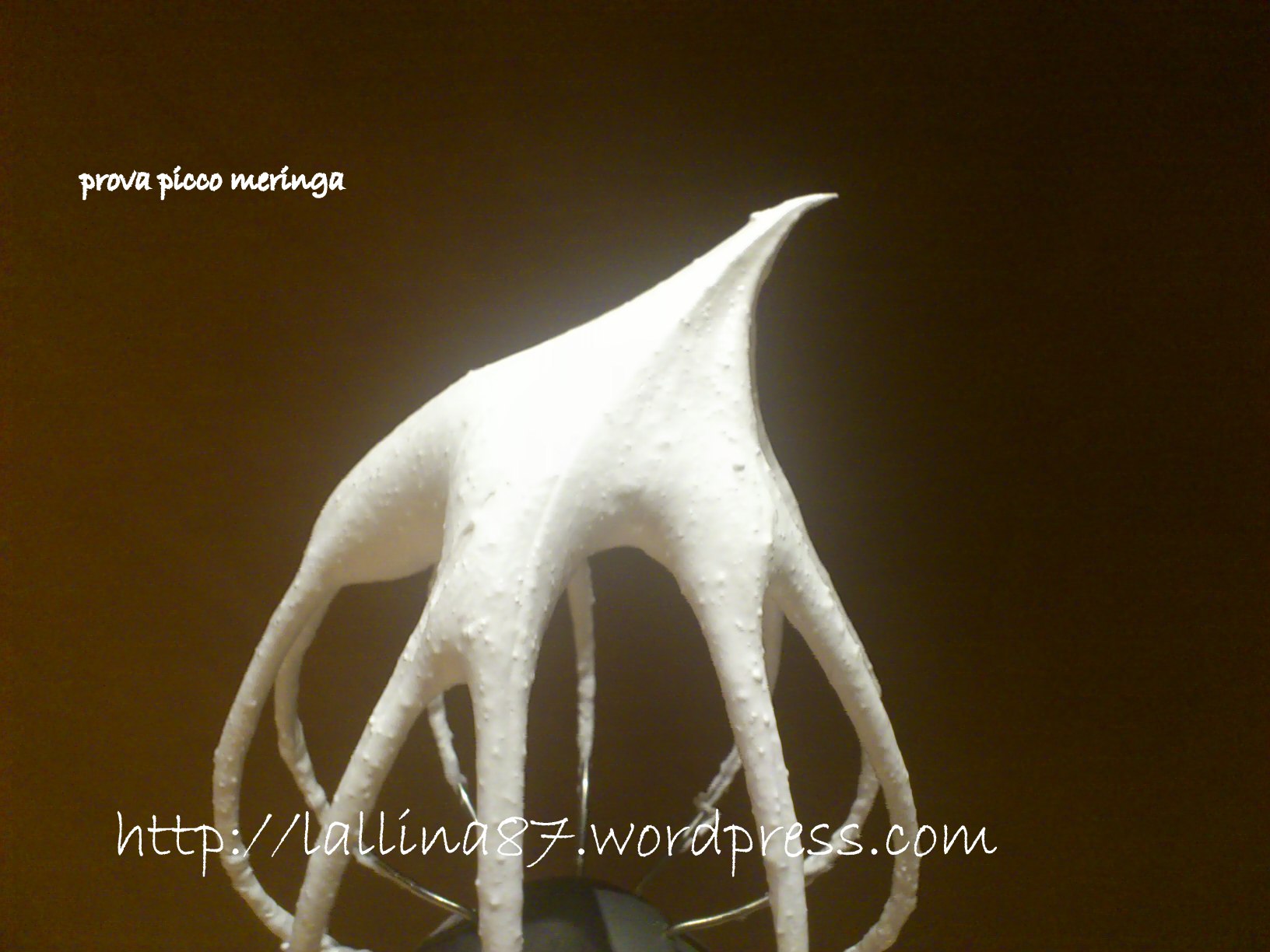 Io uso la planetaria e inizio a montare gli albumi con il cremor tartaro e il limone (per stabilizzare la montata, per mantenere il colore bianco brillante) finchè schiumano (si formano bollicine in superficie e già è almeno triplicato di volume) considerate che raggiungono anche 8 volte il volume iniziale!!!), piano piano aggungo lo zucchero setacciato, poco alla volta per permettere che si sciolga completamente ricordandosi che prima aggiungete lo zucchero e minore sarà il volume finale, e maggiore la densità delle meringhe. Continuate fino a terminare lo zucchero e fino a che la crema di meringa non sarà perfettamente stabile facendo la prova picco.