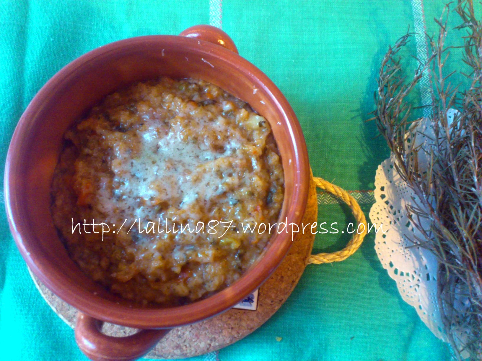 Ho rimesso sul fuoco il minestrone per ri-bollirlo, ho aggiunto altro basilico e rosmarino(che bontà!!), sale, pepe e il pane secco a pezzetti che piano piano si è ammorbidito asciugando il brodo presente. Ho spento il fuoco proprio quando riuscivo a vedere il fondo spostando il composto, ormai morbido e non brodoso; Ho portato tutto in una terrina di terracotta con il parmigiano e il filo d’olio evo, ho messo in forno sotto al grill fino a far gratinare il tutto 😛
