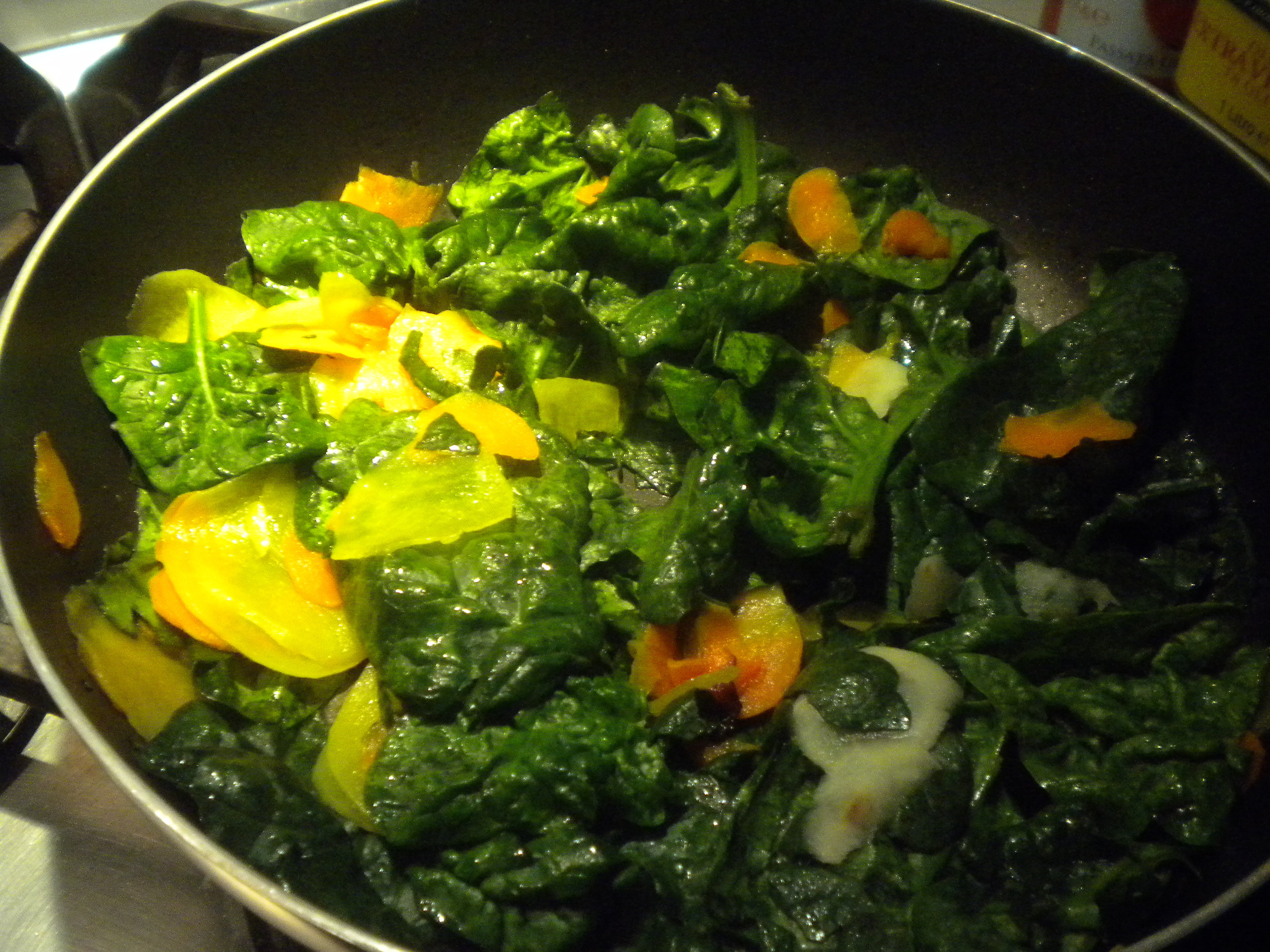 saleallora, soffriggere in un po’ d’olio l’aglio e il peperoncino, tagliare a fettine sottili carote e patate e mettete in padella, salate e fate imbiondire, a questo punto aggiungete gli spinaci fino a farli appassire,salare un altro po’, copriteli, nel caso fossero troppo asciutti aggiungere un po’ d’acqua e……in altri 5 minuti vi pappate un contorno coi fiocchi