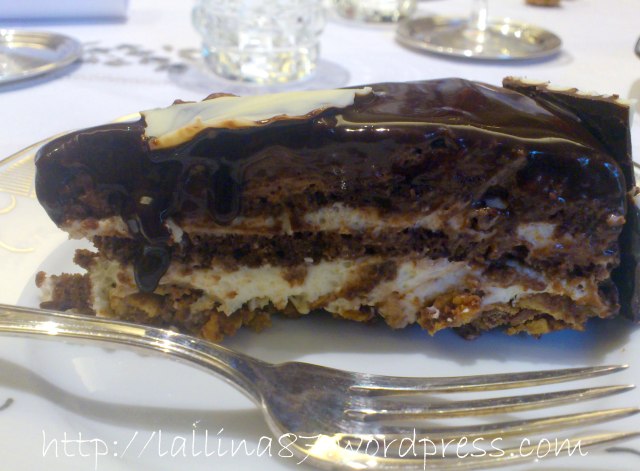 Spero sia una foto abbastanza eloquente ed esplicativa per far capire che NE VALE LA PENA!!! Un’esplosione di cioccolato, ma non “pastosa” o troppo dolce, è un gioco di consistenze: dalla delicatezza e vellutatezza delle creme con tre sfumature: chantilly, chantilly alla nocciola e chantilly al cioccolato; alla morbidezza del pan di spagna, molto sottile ma indispensabile e per affondare infine la forchettina nella croccantezza data dallo strato di fiocchi di mais e pralinato….