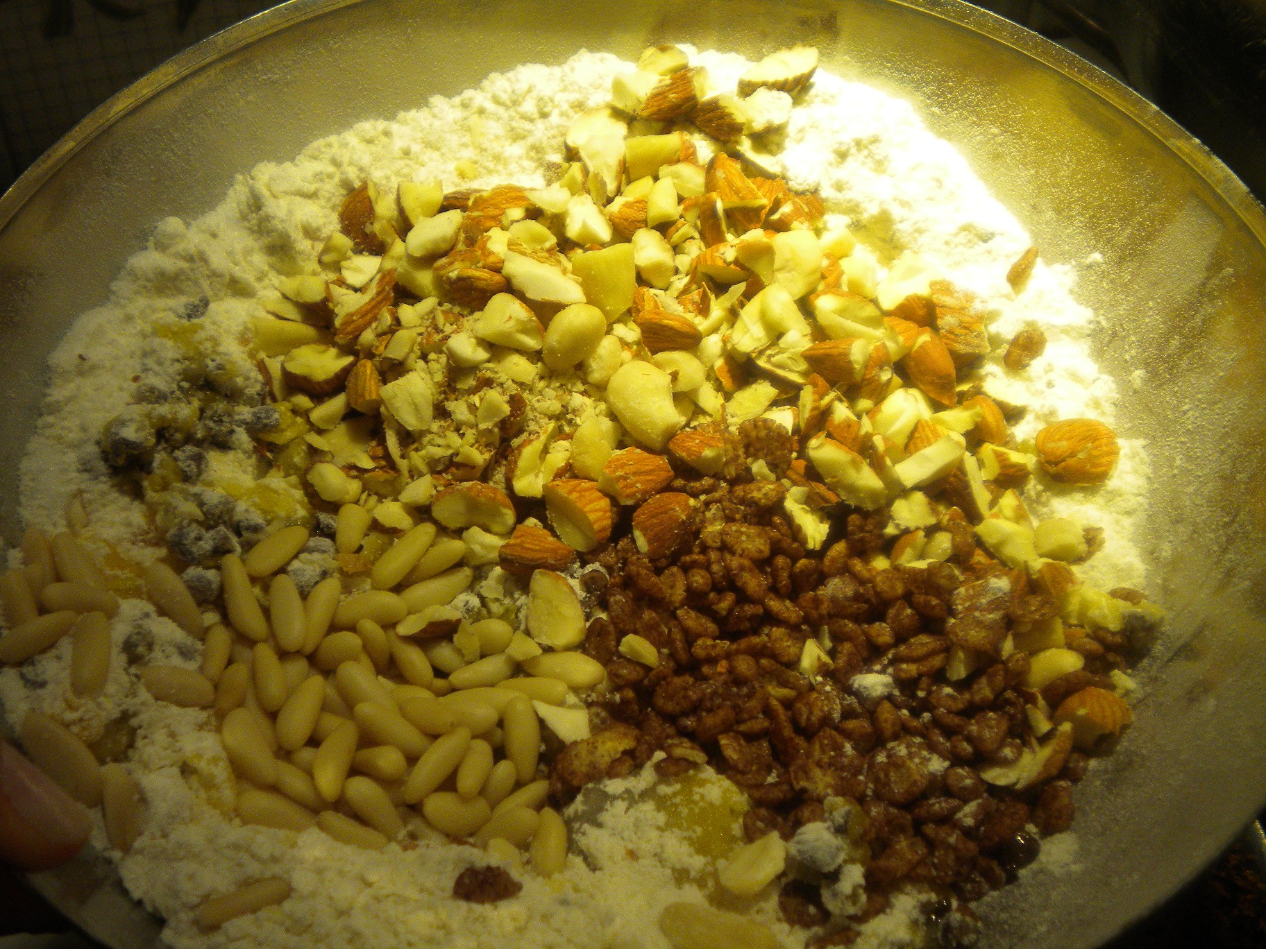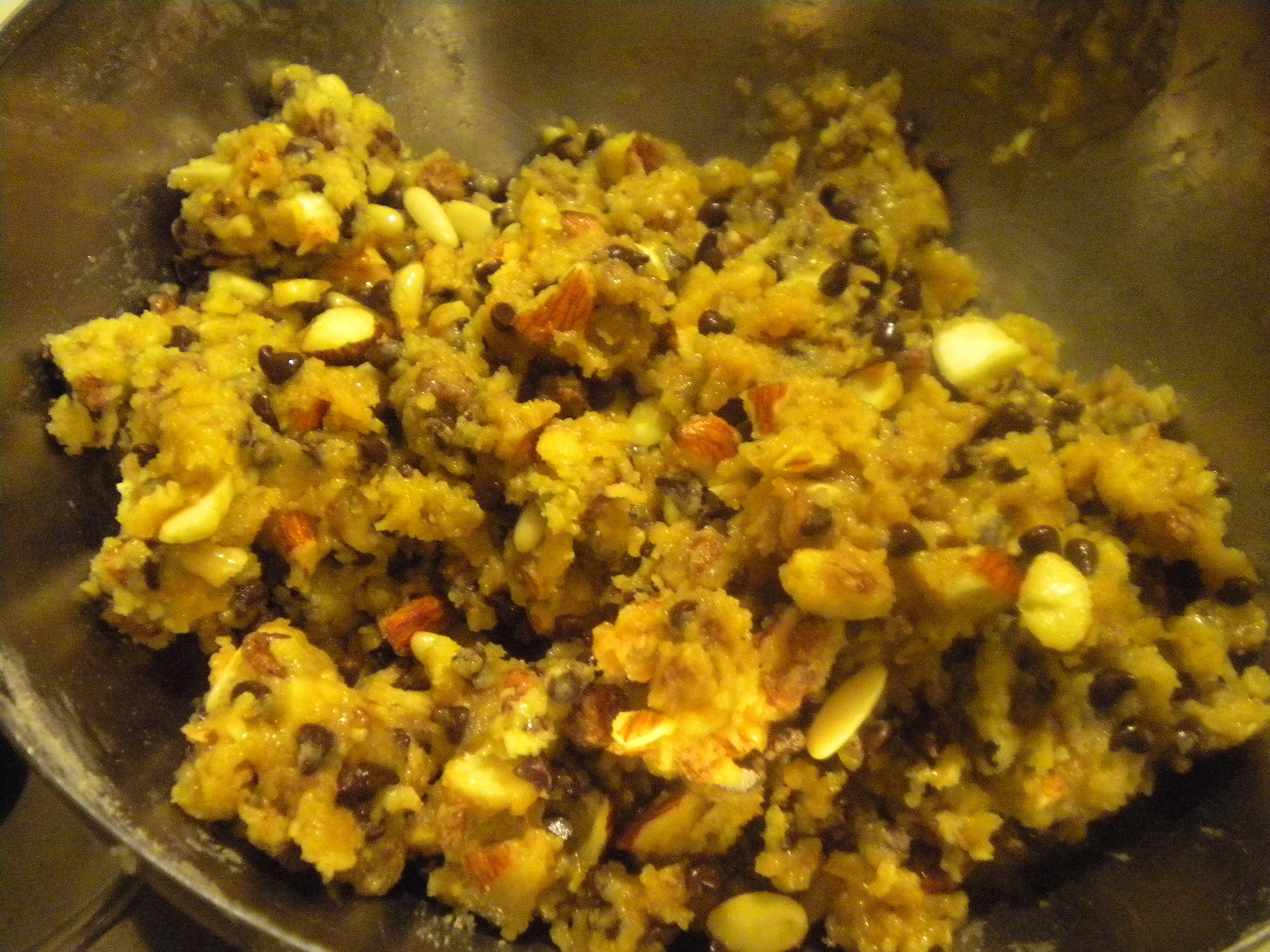 le gocce di cioccolato, i pinoli e le mandorle ridotte a pezzi…