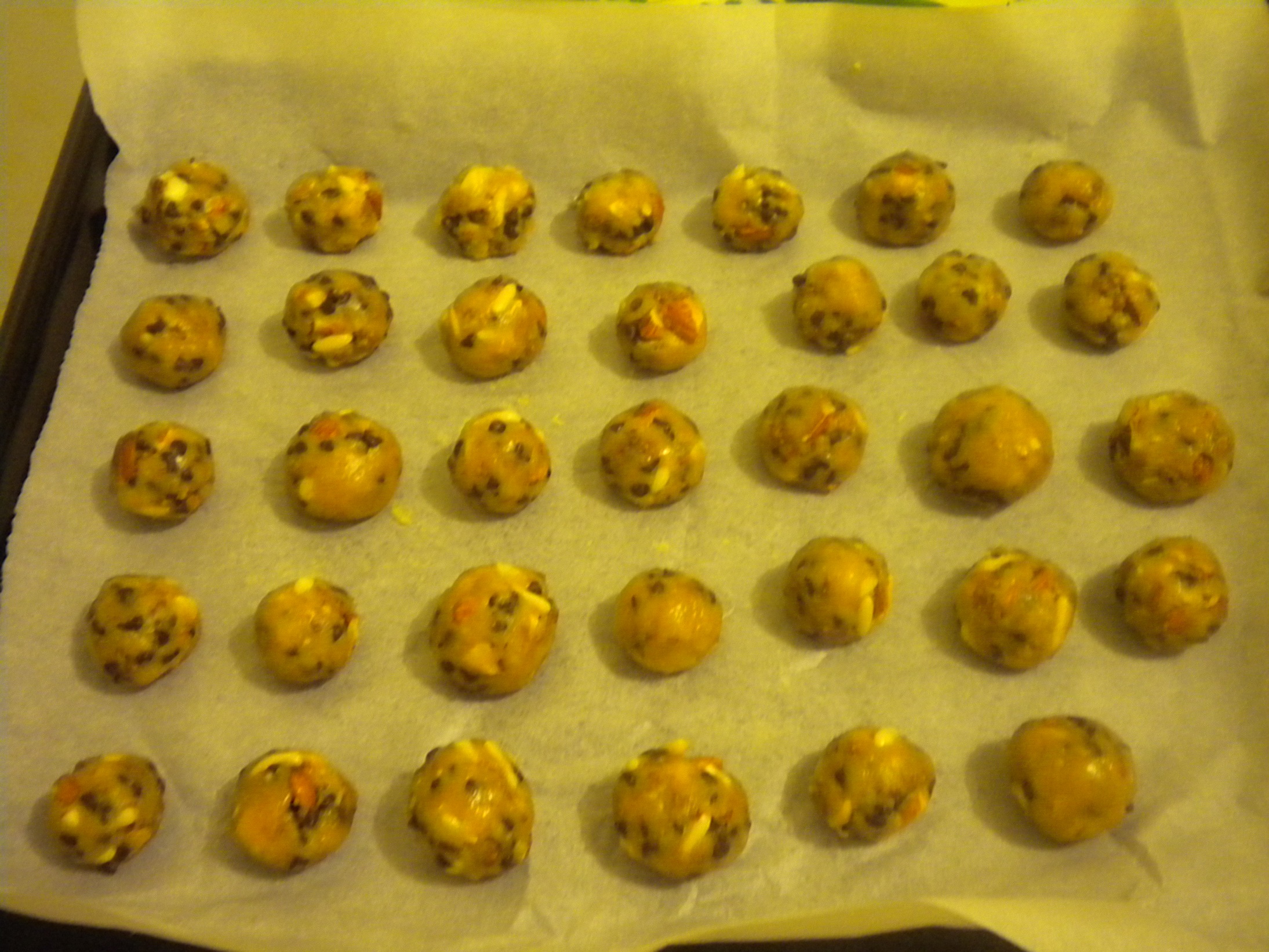 formate ora delle palline grandi più o meno come una noce e disponetele su una teglia co carta da forno, e se volete spolverate con lo zucchero a velo