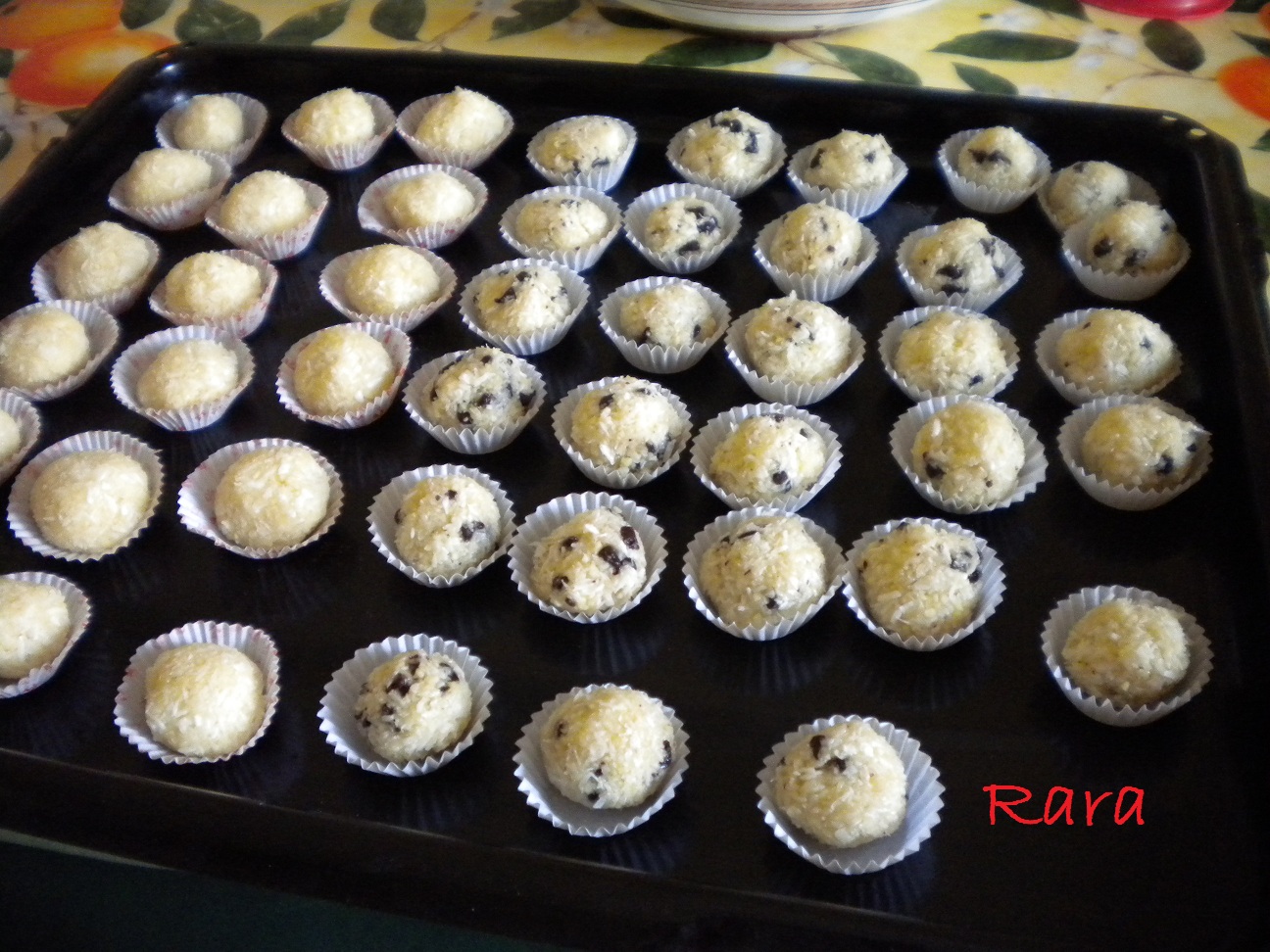 Formare ora delle palline tra i palmi delle mani bagnati, così non vi si appiccicherà ovunque e sarete costretti a rimediare……assaggiando 😀 (o se avete un’altra tecnica,quella che conoscete) grandi pià o meno quanto un bacio perugina e mettere sulla carta forno o direttamente nei pirottini come ho fatto io.