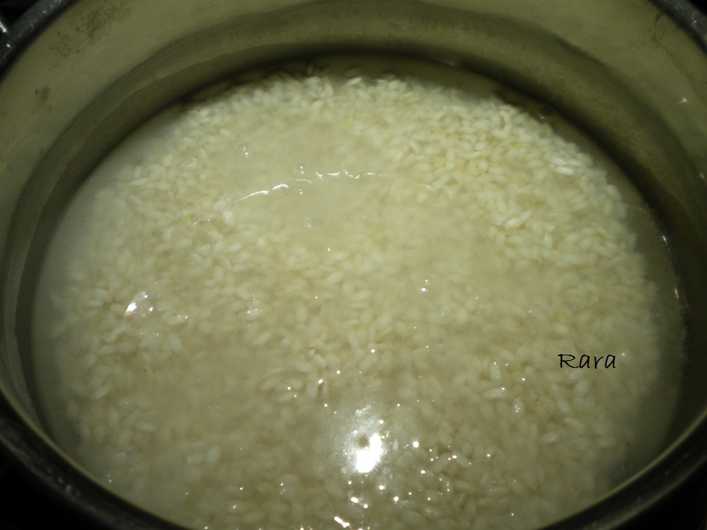 MEttere a bollire il riso con tanta acqua quanto basta per coprirlo, con la noce di margarina o burro e un pizzico di sale