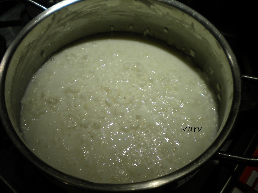 Quando il riso avrà assorbito parte dell’acqua e sarà diventato trasparente aggiungere qualche mestolo di latte caldo sufficiente per coprire il riso e lasciare cuocere mescolando spesso Ricordandosi che il latte deve restare sempre sul fuoco, al minimo, per mantenere sempre la temperatura.