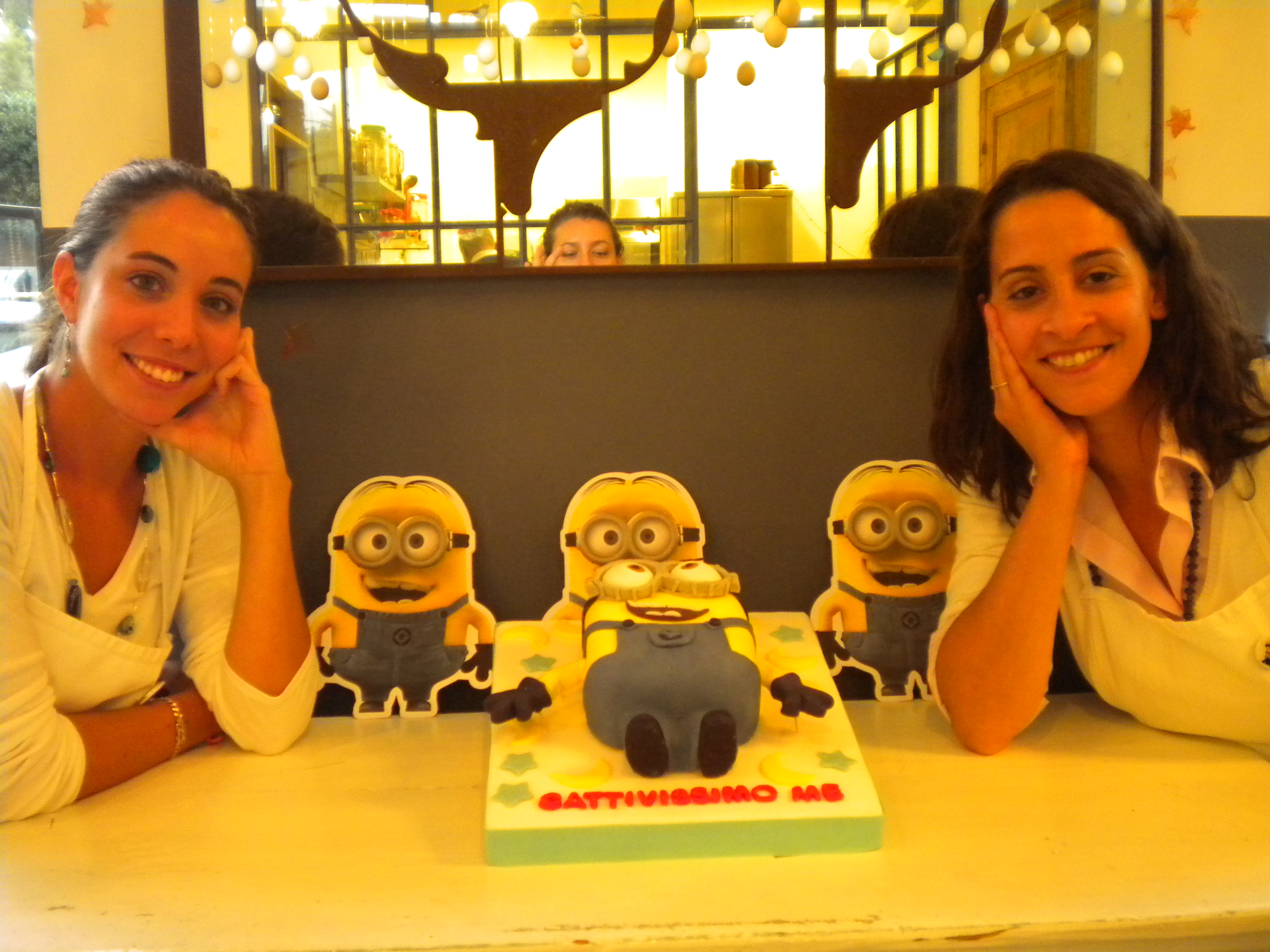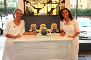 Ecco, vedete quei pupazzetti gialli? Proprio uno di loro abbiamo riprodotto con l’aiuto della proprietaria della pasticceria!