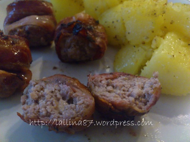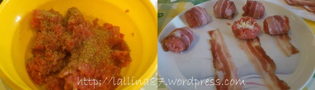 Mischiare la carne con gli altri ingredienti per formare l’impasto della polpetta che si metterà all’interno della Fettina di pancetta. Stendere la pancetta su un piatto, poggiare la polpetta con un po’ di parmigiano all’interno(non avevo altro, ma l’ideale sarebbe un formaggio poco stagionato) all’inizio della fetta e avvolgere, come in foto.