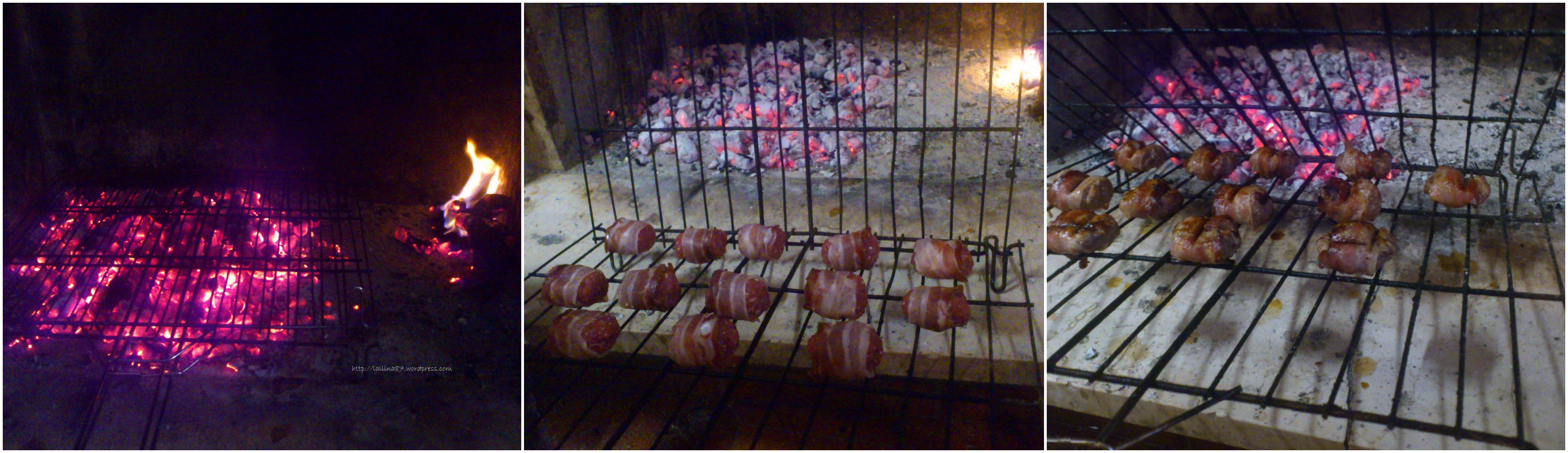 Nel frattempo la brace sarà pronta – o una griglia/ padella antiaderente, ma le originali le abbiamo mangiate cotte al barbecue – e si potranno chiudere le bombette tra la griglia per cuocerle davvero pochissimo, forse 4 minuti per lato… ma controllatene l’interno, la carne di maiale è bene cuocerla totalmente (soprattutto quella del super, quella del macellaio di paese di fiducia si può fare uno strappo 😉 )