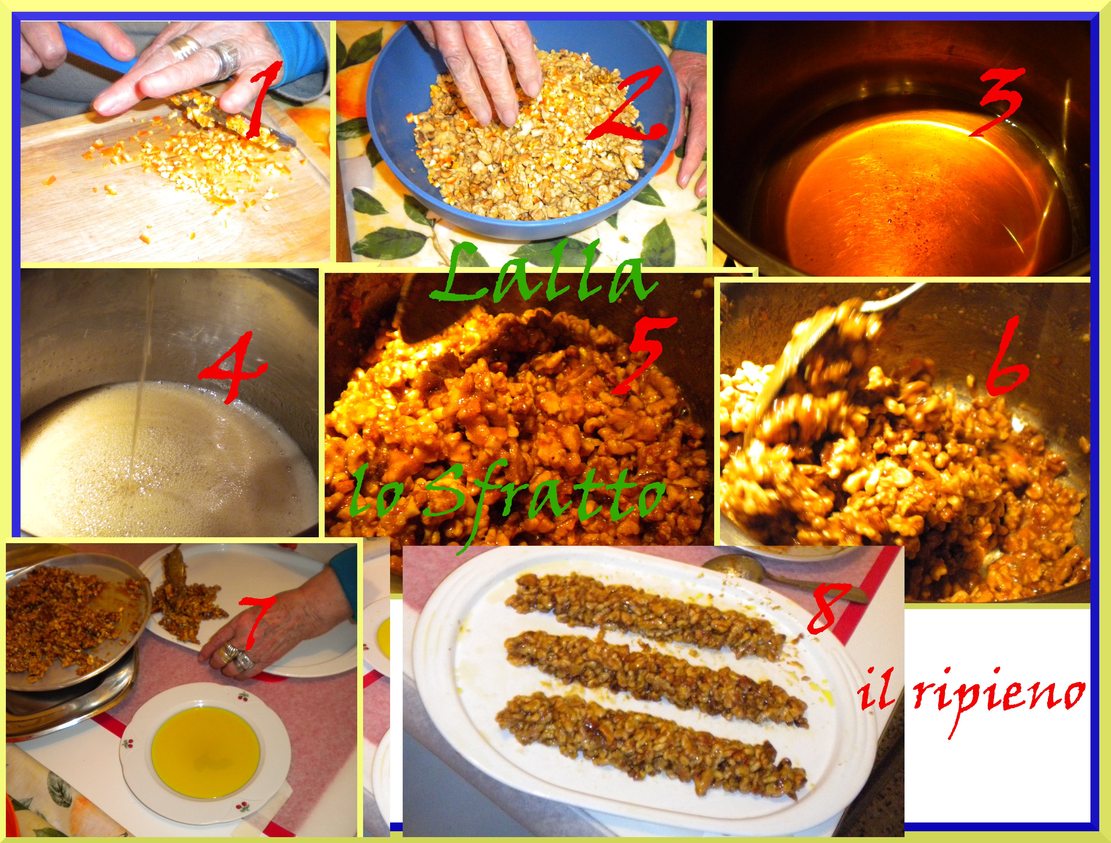 Prima di tutto sgusciate le noci e riducetele in pezzetti più piccoli, ma cmq grossolanamente e unite le spezie e le scorze degli agrumi tritate (foto 1-2) Nel frattempo mettete a bollire il miele per circa 20 minuti (foto 3) o cmq fino a che alzandolo con un cucchiaio non formerà un filo (foto 4). A quel punto aggiungere le noci (foto 5). Mescolare bene il tutto e far bollire ancora per 8-10 minuti (foto6) (se risulterà troppo lento aggiungere del pan grattato).