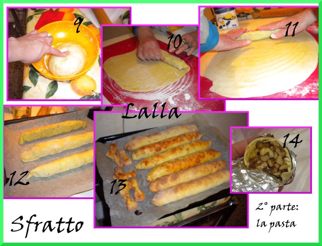 e arrotolarci i serpentelli di noci cercando di smussarli per renderli più cilindrici possibili, e far fare un giro e mezzo o 2 di pasta(foto 11). Continuare fino a formare 6 sfratti(foto 12), spennellare di latte o chiara d’uovo e infornare a 180°C per 15 minuti circa e a 200°C x altri 5minuti, ed eccoli pronti (foto 13)! lasciar freddare e gustarli dopo averli tagliati a tocchetti (non a fettine) (foto 14) accompagnati da un buon limoncello
