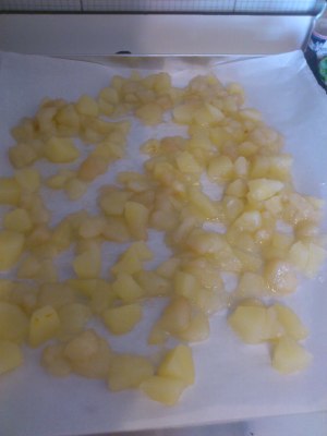 Sbucciare le pere e tagliarle a dadini e metterle in un pentolino dove si è fatto sciogliere lo zucchero semolato con l’acqua e lasciar caramellare, far freddare poi le pere distese su carta da forno.