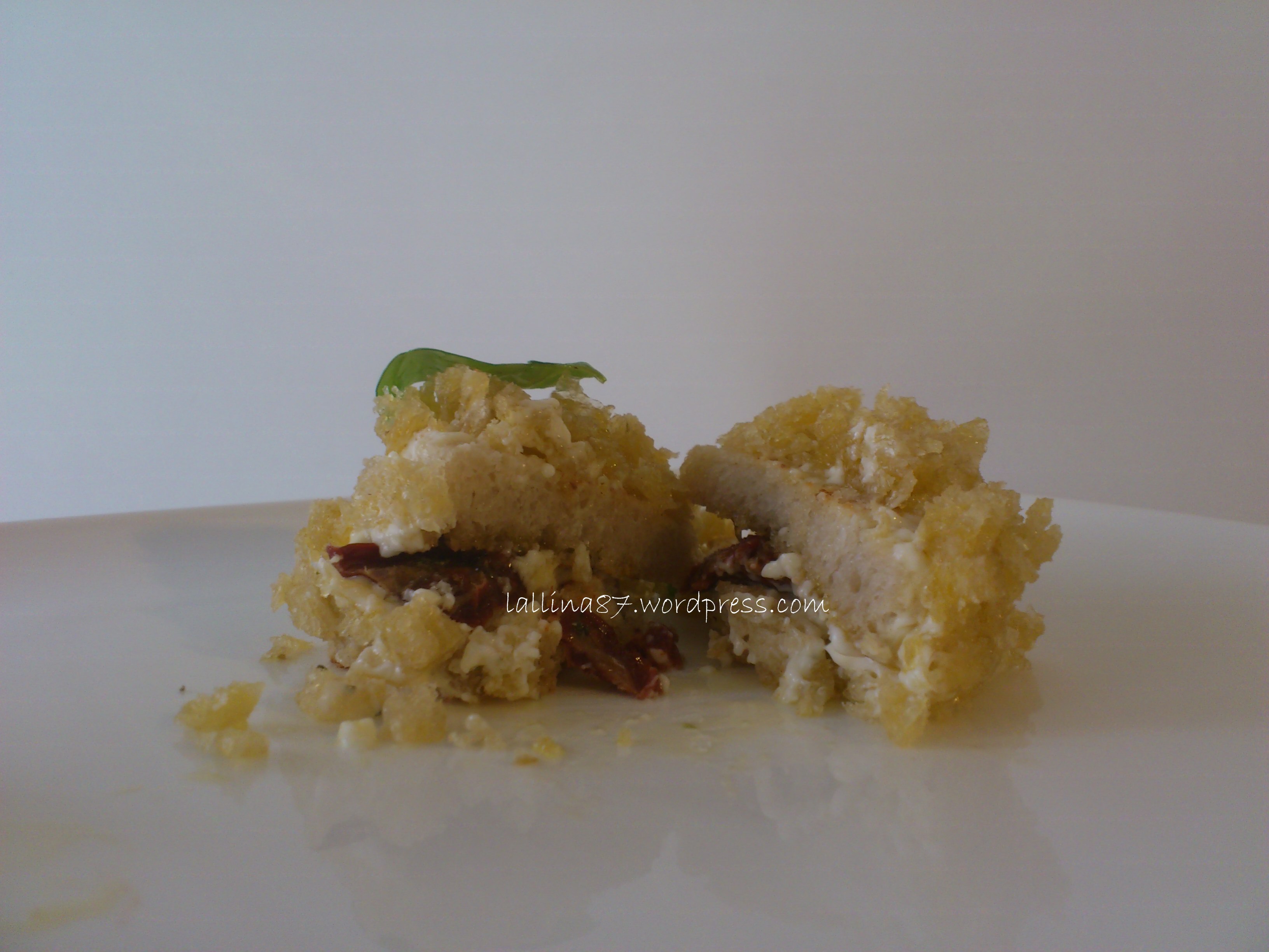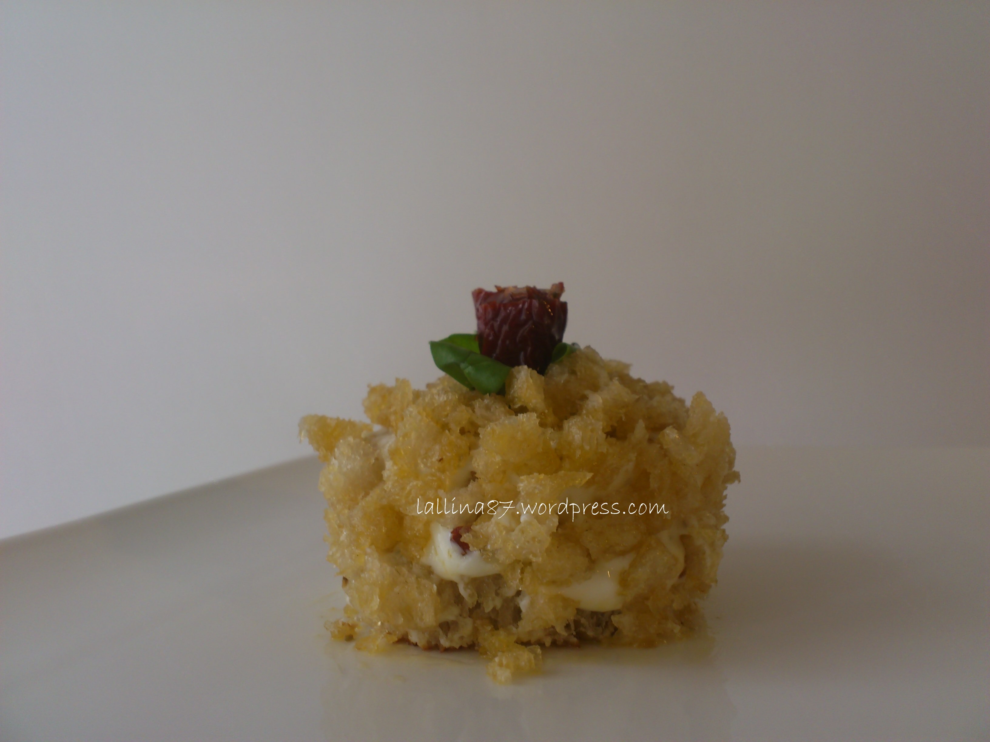 Quindi nel coppapasta ho alternato il cerchietto di pane, bagnato con l’olio dei pomodoretti secchi, lo stracchino, 2 pomodoretti secchi e di nuovo il cerchietto di pane. Ho tolto il coppapasta, ho spalmato lo stracchino sopra e tutto intorno; ho bagnato – lo so non è proprio leggero ma lì per lì mi è venuto in mente solo questo per rendere il pane giallino- i dadini di pane nell’olietto dei pomodori e l’ho fatto aderire alla torretta, decorato con metà pomodoretto e basilico:) Questo il risultato finale, a me sembra sia di grande effetto