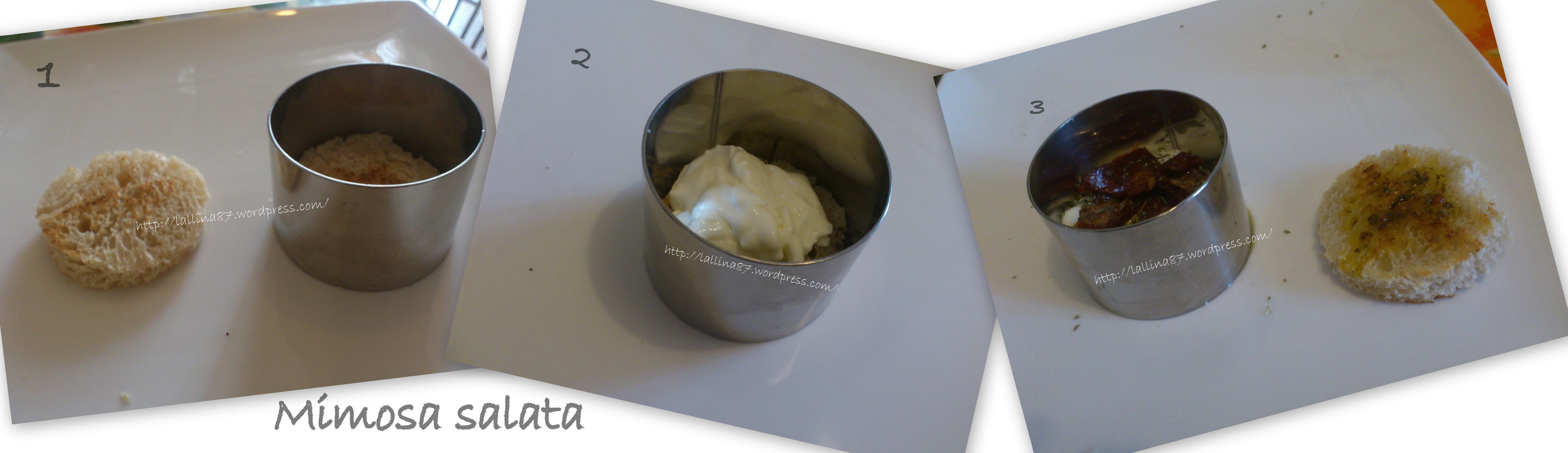 Vi ricordate il pane dell’altro giorno, il filoncione? Non essendo più così fresco e morbido ho pensato di dargli una rinvigorita su una padellina antiaderente ardente, scusate il gioco di parole! Ed è lì che prima mi è venuta in mente una millefoglie, lasagnetta chiamatela come volete, insomma una torretta farcita, ma non volevo la classica mezza fetta una sull’altra! Così ho preso il coppapasta tondo e gira che ti rigira (ho girato e spinto insieme l’anello di acciaio per tagliare ;)) ho creato due cerchietti dalle due metà fette, le ho appena abbrustoliste…e mentre facevo quest’operazione notavo che effettivamente c’era ancora parecchia mollica vicino alla crosta…e pensavate l’avrei buttata? Ma no! Ed è lì che ho pensato di tagliarla a dadolini per fare la parte esterna della Mimosa salata!
