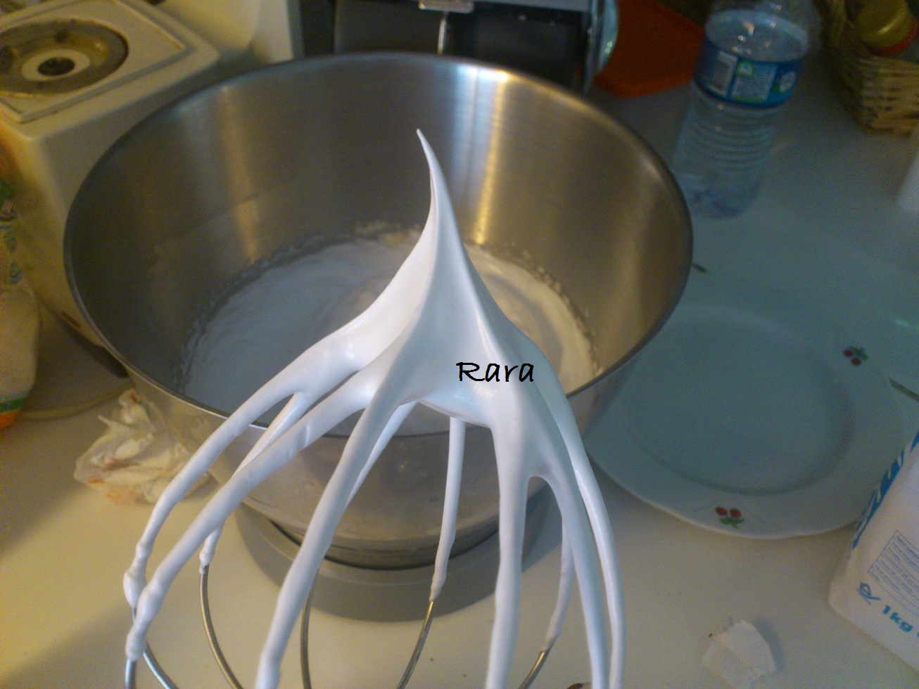 Ho iniziato a montare gli albumi con un pizzico di sale, i quando si sono formate le bollicine ho aggiunto piano piano i 60 gr di zucchero e le gocce di vaniglia… quando erano quasi montati, in un pentolino ho preparato lo sciroppo versando i 25 ml di acqua, i restanti 60 gr di zucchero portando a bollore ( è pronto quando tutta l’acqua è coperta di bollicine); l’ho versato a filo sugli albumi continuando a montare fino ad ottenere una meringa bella soda.