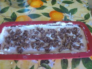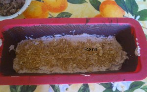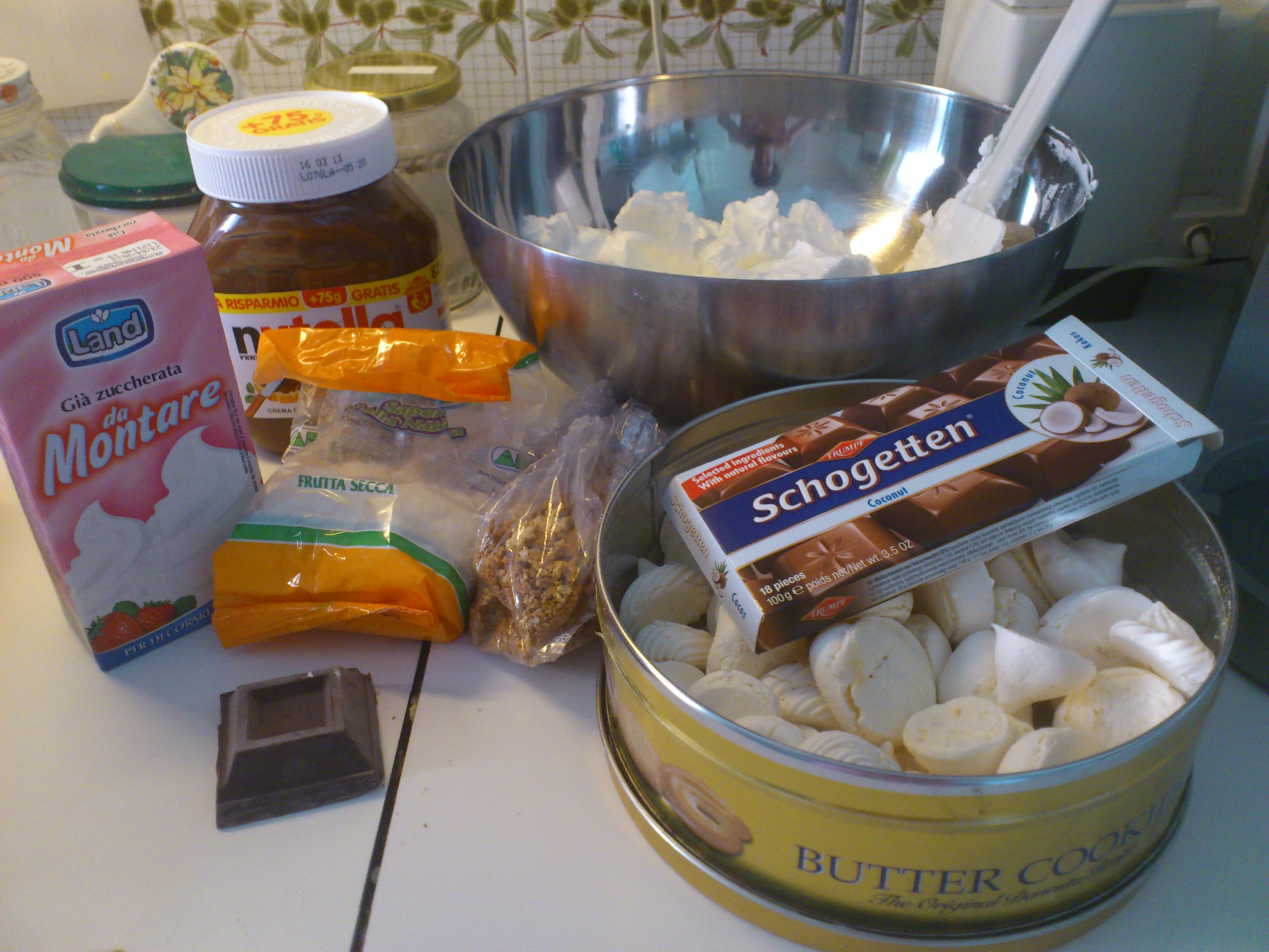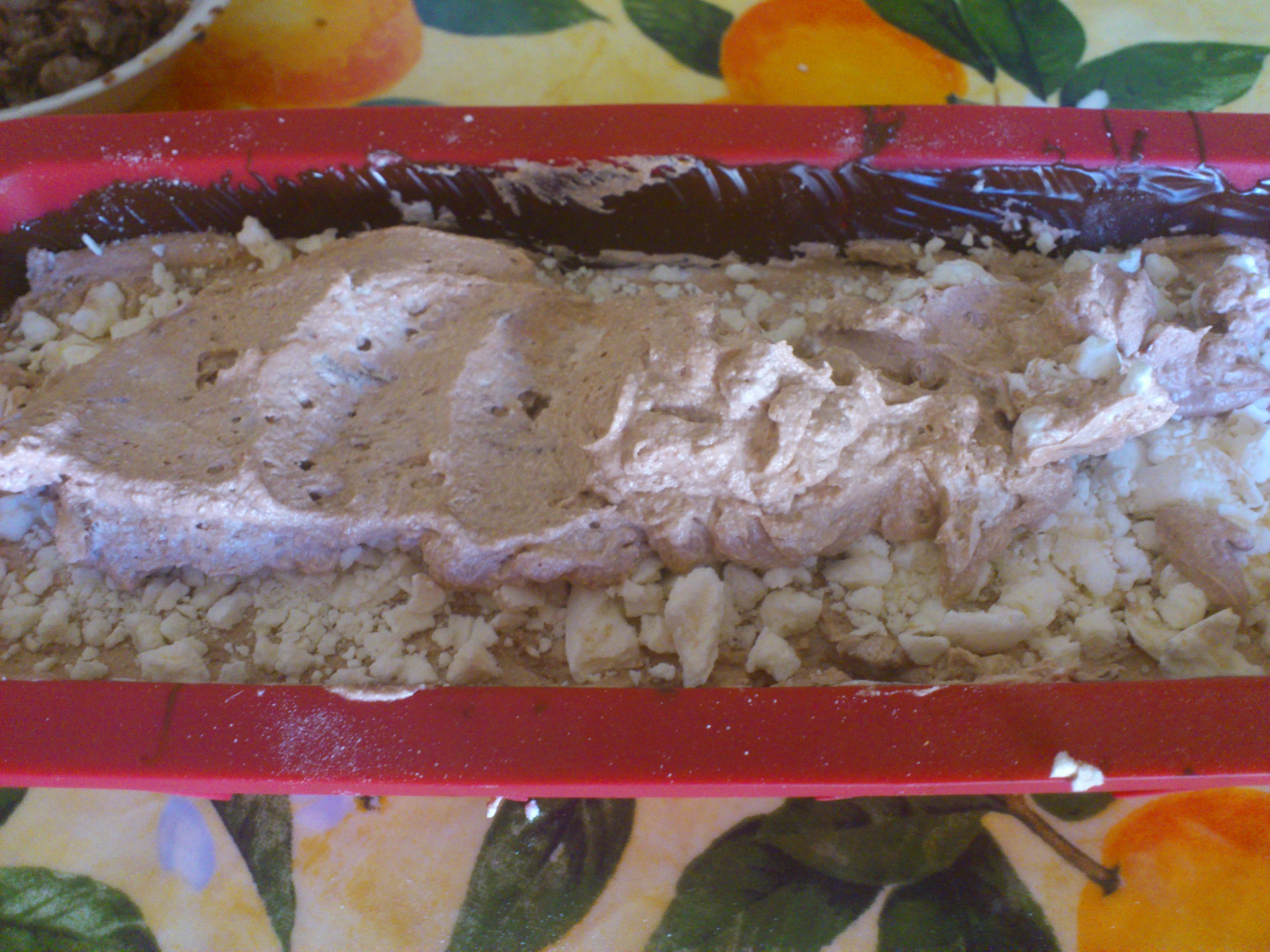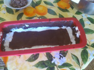 Io poi ho alternato i diversi strati in uno stampo in silicone da plumcake: uno di semifreddo alla nutella e uno al cocco e tra l’uno e l’altro ho messo amaretti, la barretta di cioccolato al cocco, lo strato di cioccolato fondente