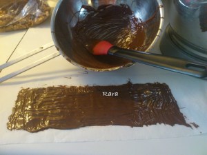 Ho sciolto il cioccolato fondente a bagnomaria (usate il microonde se lo avete) e spennellate il cioccolato sulla carta da forno in un rettangolo o la forma del vostro contenitore e mettete in freezer a solidificare, si staccherà facilmente.