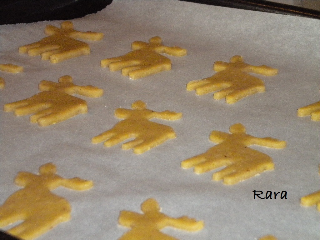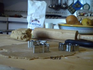 Stendete a circa 4 mm di spessore, tagliate la frolla della forma desiderata ed infornateli a 190 gradi (statico) per 6 o 7 minuti (ventilato a 175°C se su più placche), e spostateli subito su una gratella per interrompere la cottura.