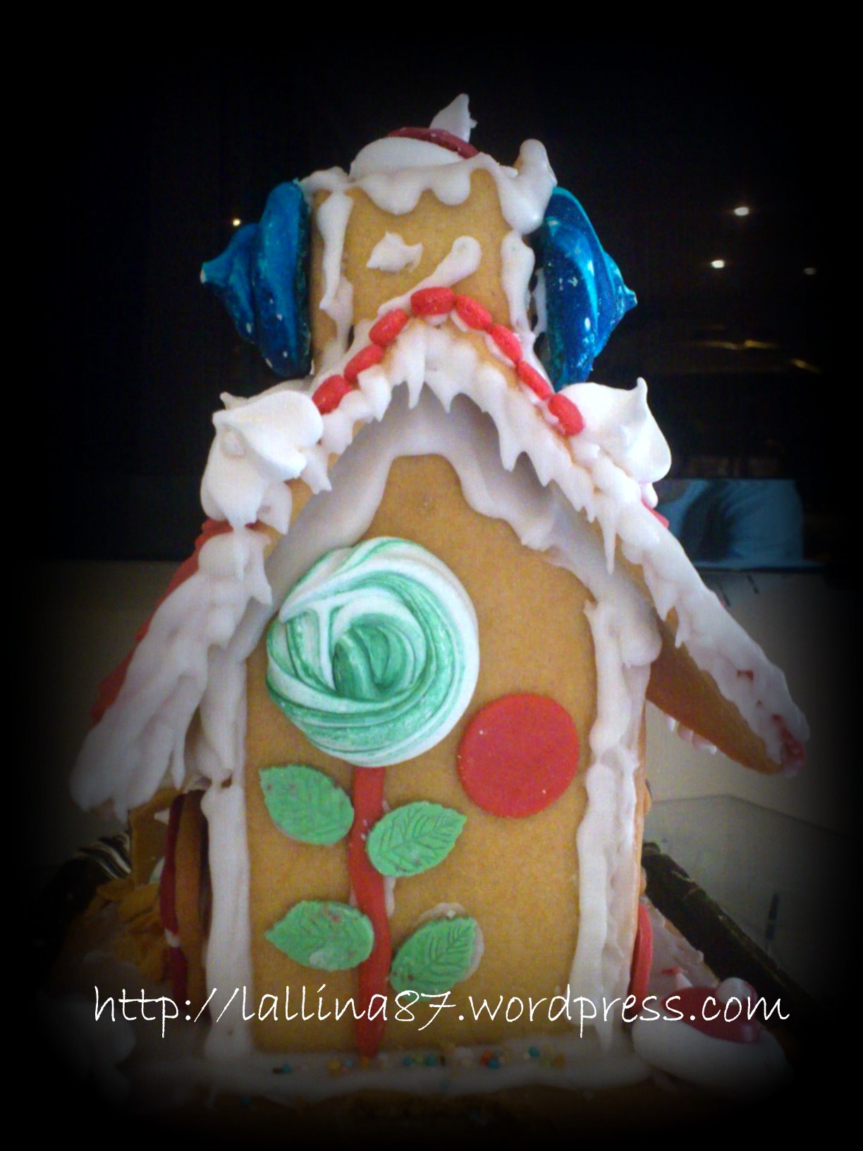 nell’ordine: base a cui ho incollato le pareti laterali e poi il retro, il fronte, ho lasciato asciugare una notte e ho incollato anche il tetto. La glassa si mette sempre nella parte interna.