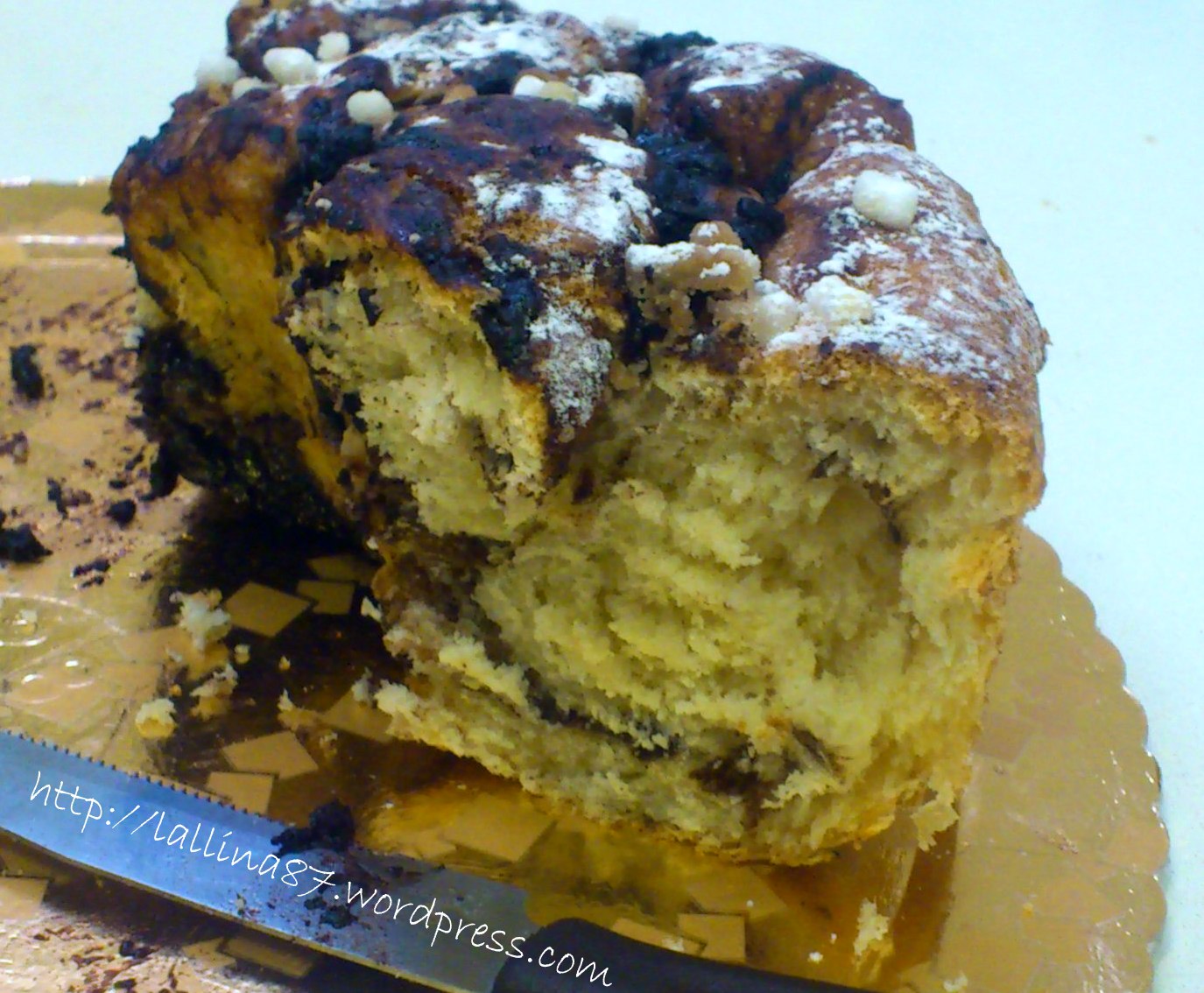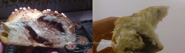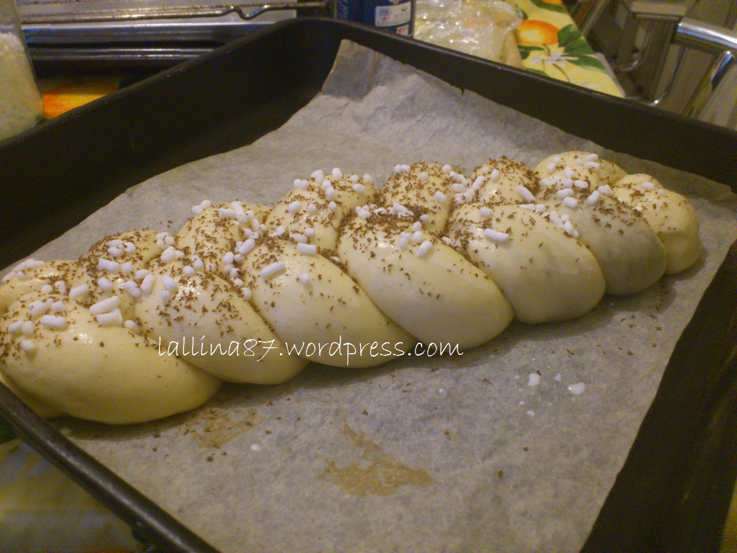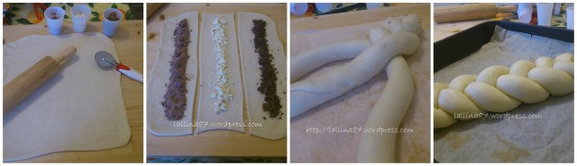 - Ho praticato un taglio netto longitudinale lungo il lato lungo e intrecciare i due mezzi rotoli tra loro formando un torciglione che tenendo il taglio verso l’alto, (io l’ho messo in una ciambelliera da 26cm (per mezza dose)