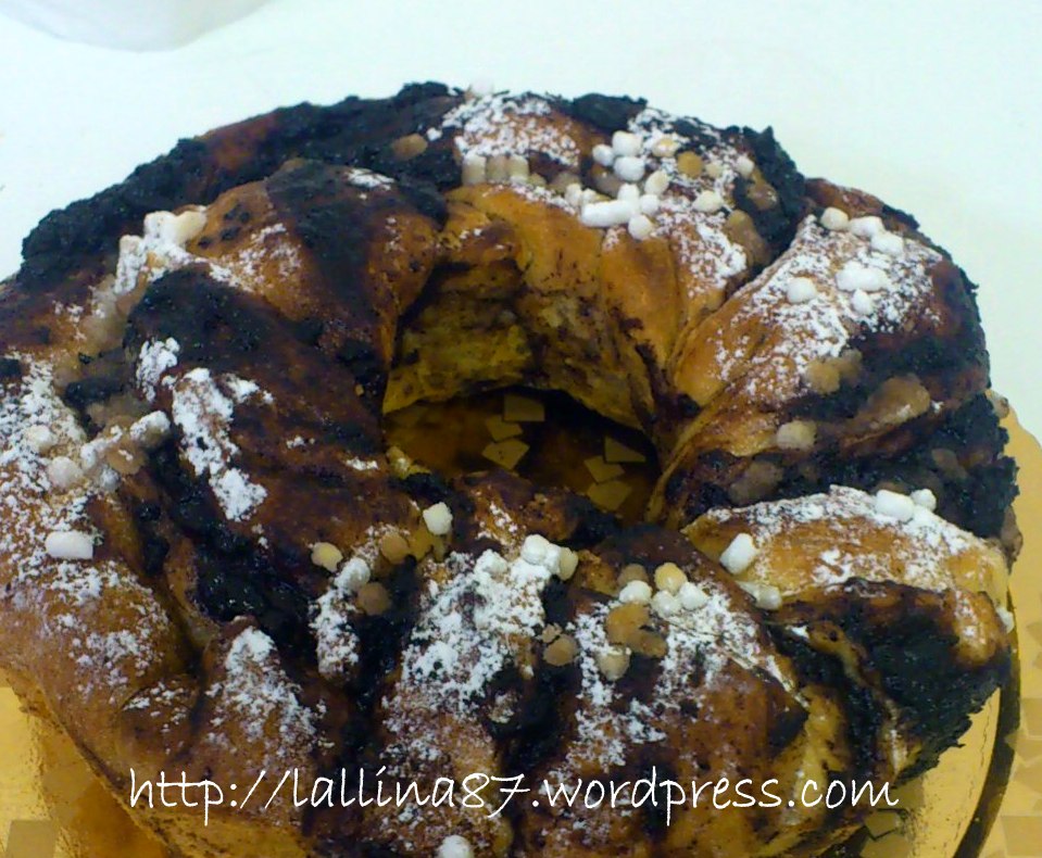 La base è quella della treccia soffice ai tre cioccolati, ma farcita con la marmellata e formata come la torta angelica.