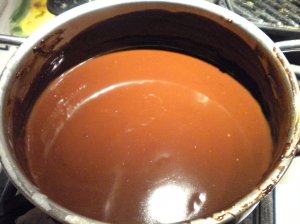 ganache piccante al cioccolato fondente : 375g cioccolato fondente tritato, 300g panna fresca 1 cucchiaio di latte, 1 cucchiaino di peperoncino in polvere. Ho scaldato la panna con il latte e il peperoncino e ho aggiunto poi il cioccolato tritato quando la panna ha raggiunto il bollore. Utilizzata il giorno dopo dopo averla stiepidita appena il necessario per renderla fluida tanto da coprire bene i bignè farciti tuffati dentro 😀