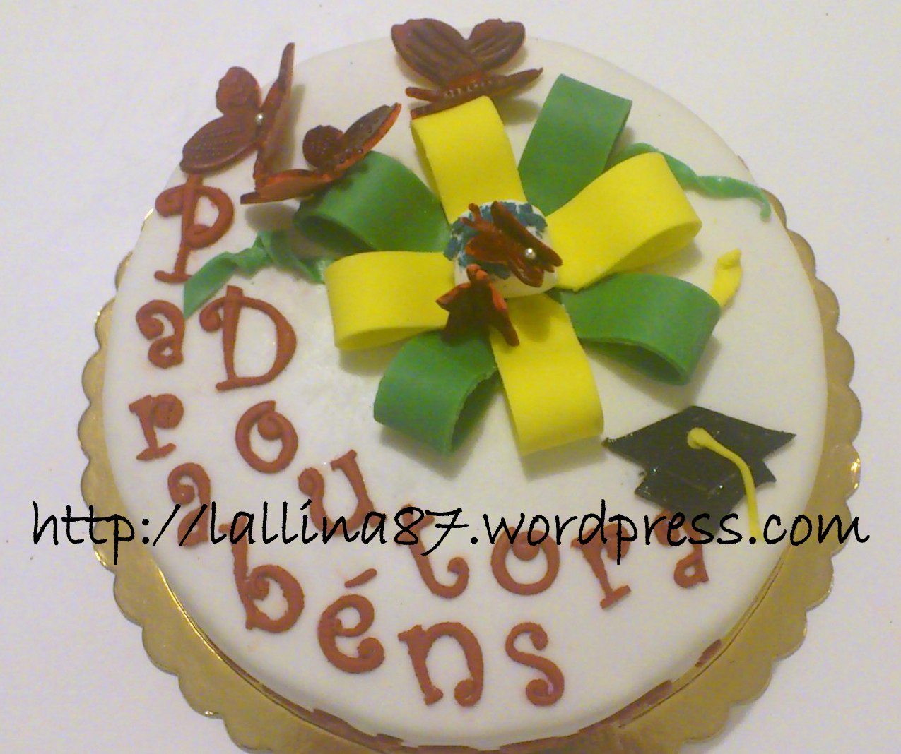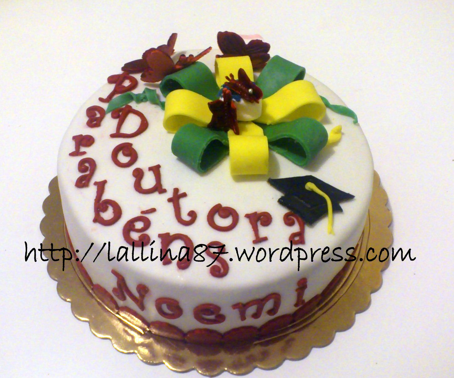 Bene, l’idea principale c’era, ma come decorarlo per renderlo festoso e vestito a festa di Laurea del mio Raro? Ho chiesto anche consigli e alla fine, dopo aver comprato i peperoncini a pallina e classici ma arancioni per la corona di alloro, cercando qualcosa di rosso, in quanto colore re della festa, ho scelto proprio di metterci le palline di peperoncino! Infatti mi era stato espressamente richiesto di non fare pupazzetti, tocchi e quant’altro in pasta di zucchero, io però una eprgamena per poter scrivere Finalmente è finita! Auguri Dottore l’ho dovuta aggiungere! 😀 Non ho resistito!