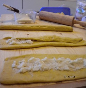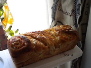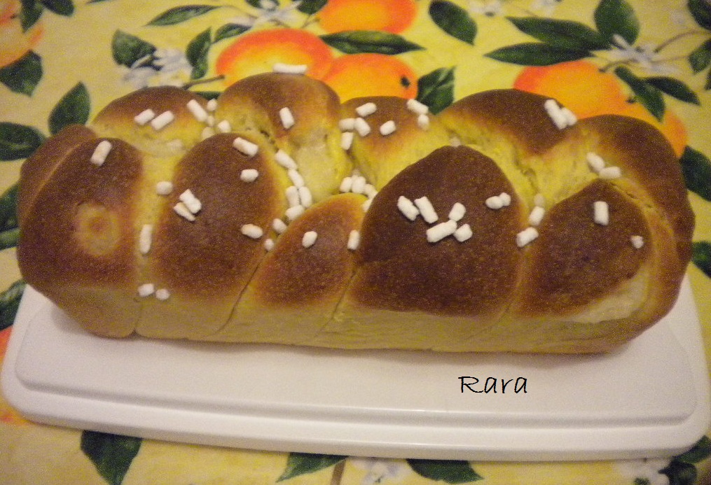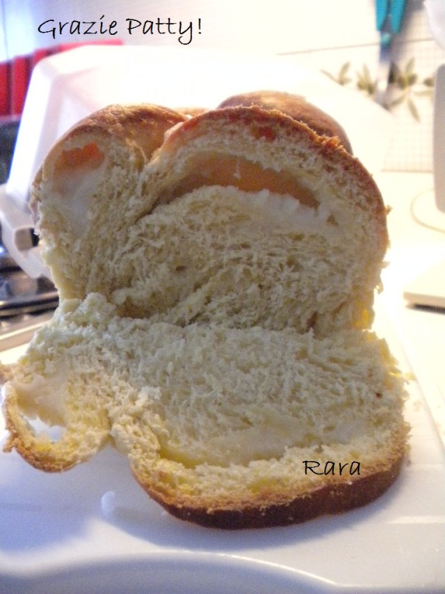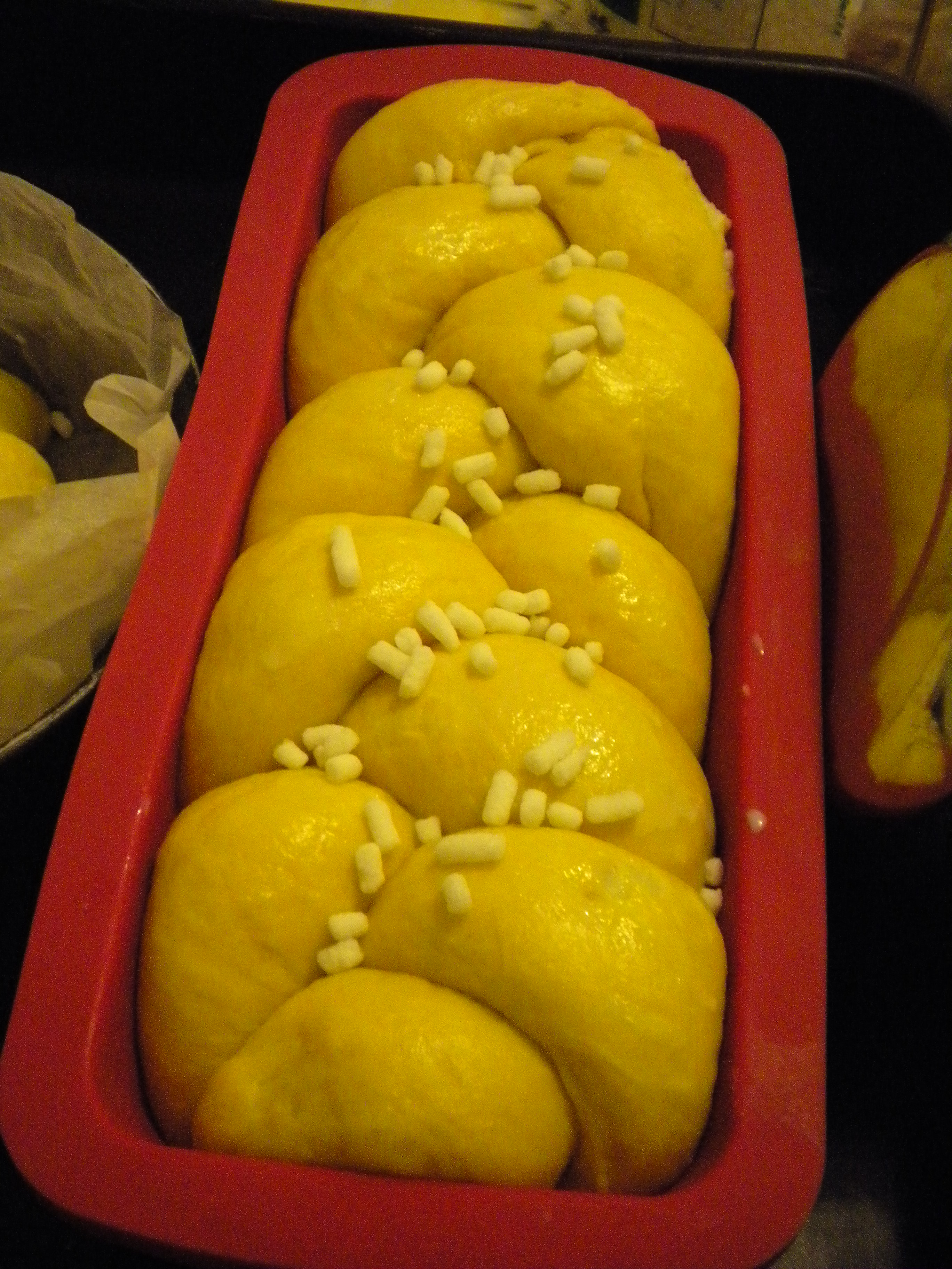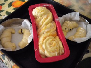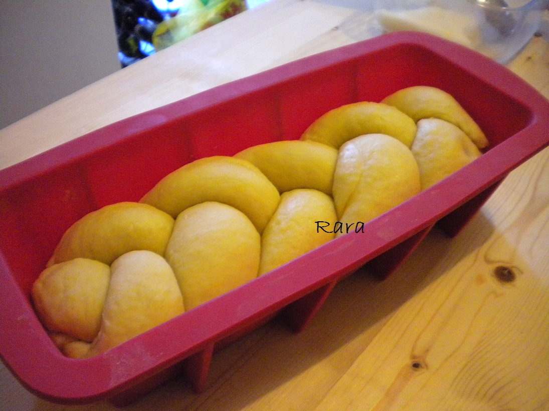 N.B. per far lievitare la treccia senza che si deformi nè in puntata nè in cottura, avendo io lo stampo in silicone lo sistemo così nella teglia 🙂
